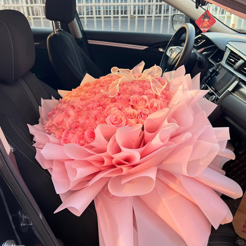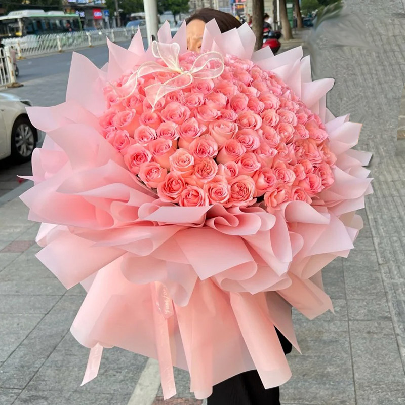 花 材:精选99朵粉玫瑰,1只粉色蝴蝶结装饰花面。