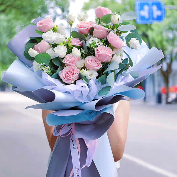 花材: 19朵混搭玫瑰(11朵粉玫瑰、8朵白玫瑰),洋桔梗、相思梅,尤加利叶装饰。