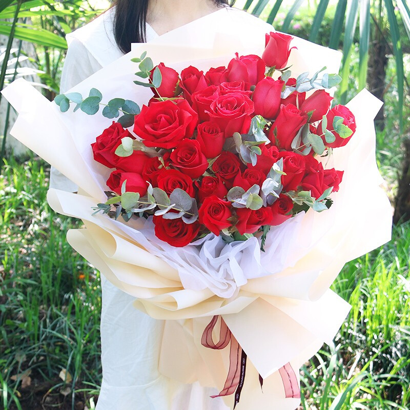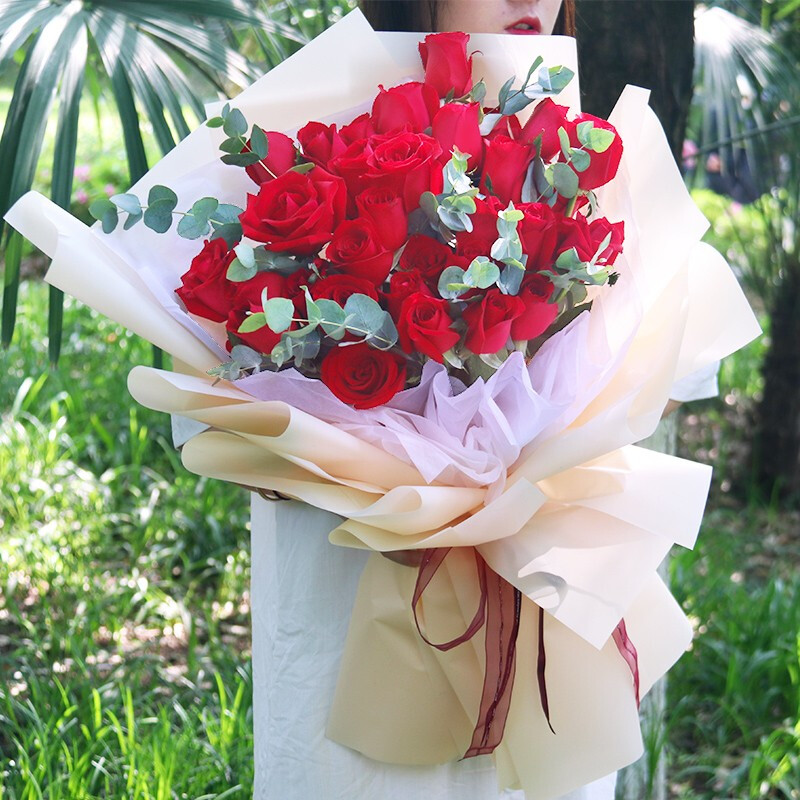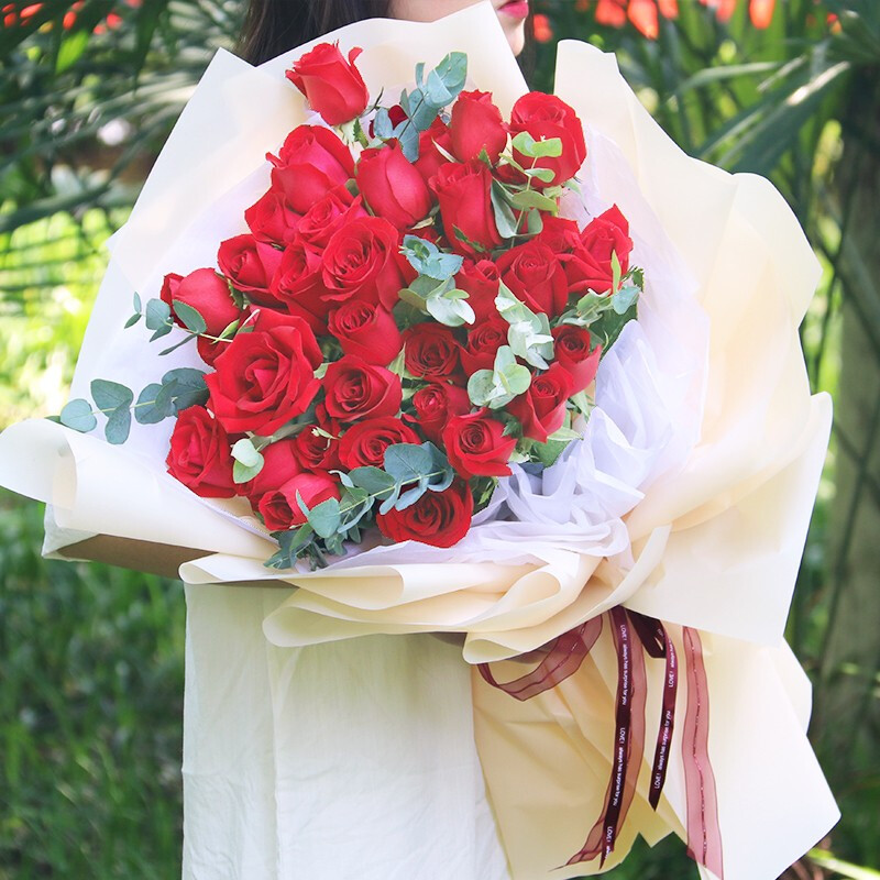 花材: 33朵红玫瑰,尤加利叶装饰。