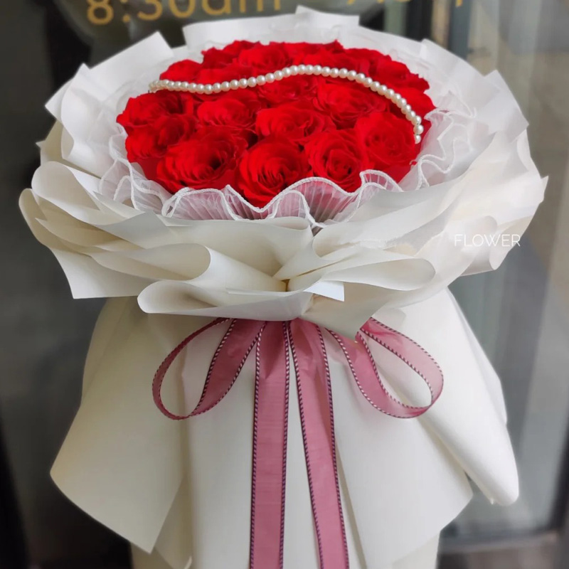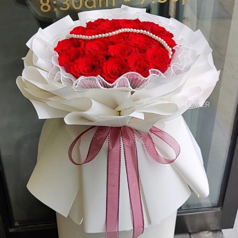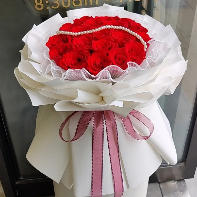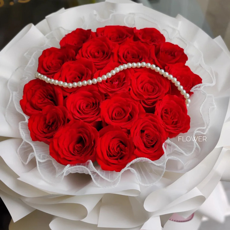 花材: 19朵红玫瑰,1条珠串装饰花面。