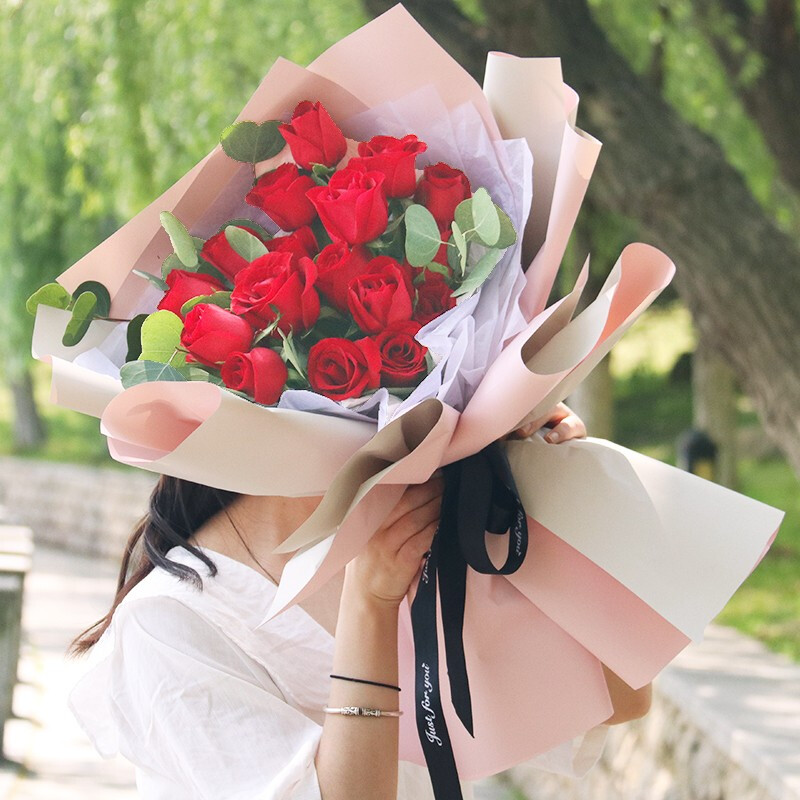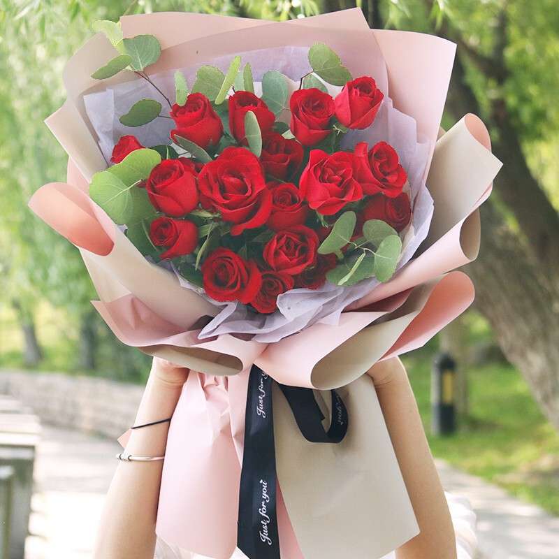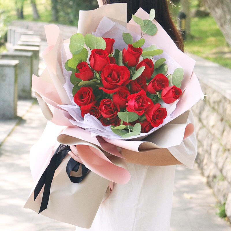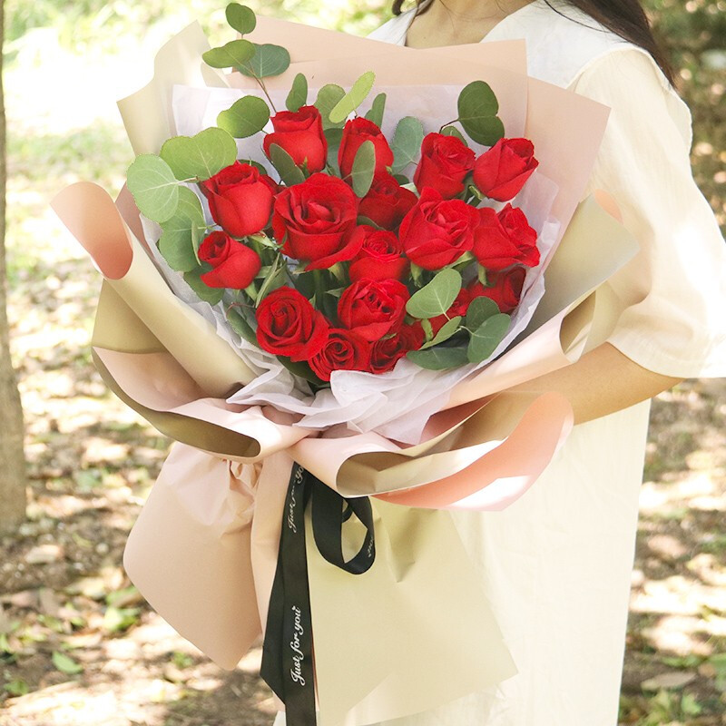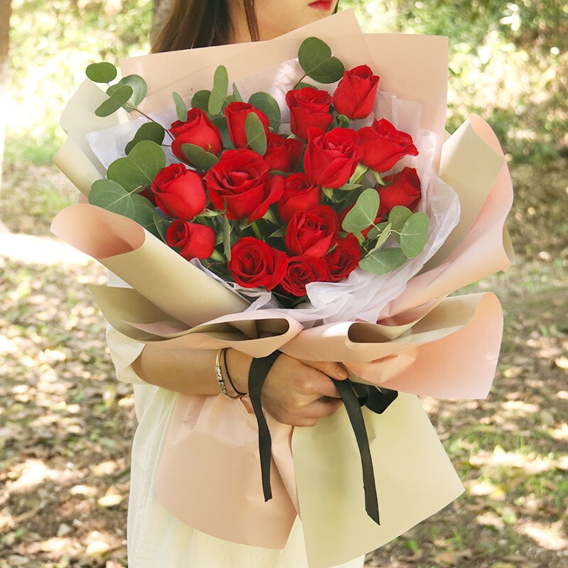 花材: 19朵红玫瑰,搭配尤加利叶、栀子叶装饰。