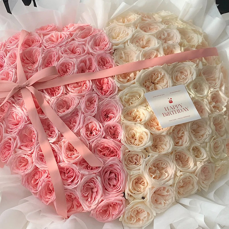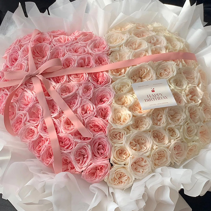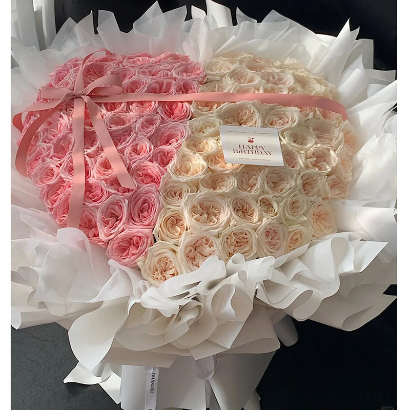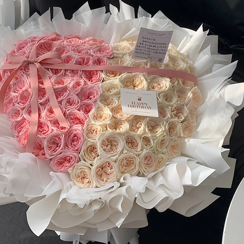 花 材:粉荔枝玫瑰、白荔枝玫瑰共99朵,一半粉色、一半白色组成心形造型,搭配粉色丝带蝴蝶结装饰花面。
