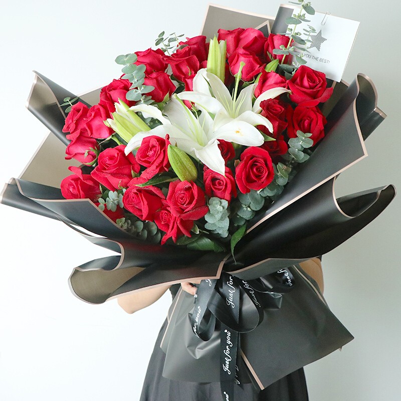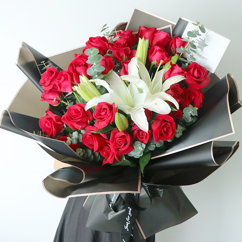 花材: 33朵红玫瑰,1支白色多头香水百合,搭配尤加利叶装饰。