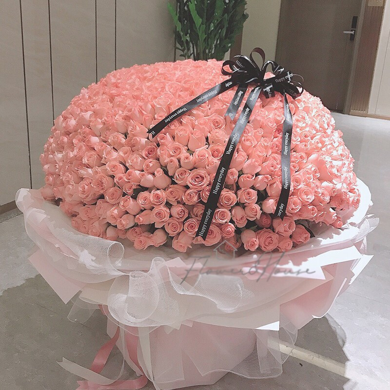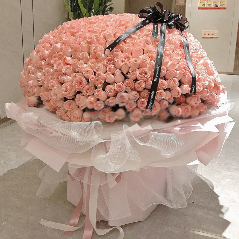 花 材:精选999朵优质粉玫瑰,花球造型,表面黑色缎带蝴蝶结。