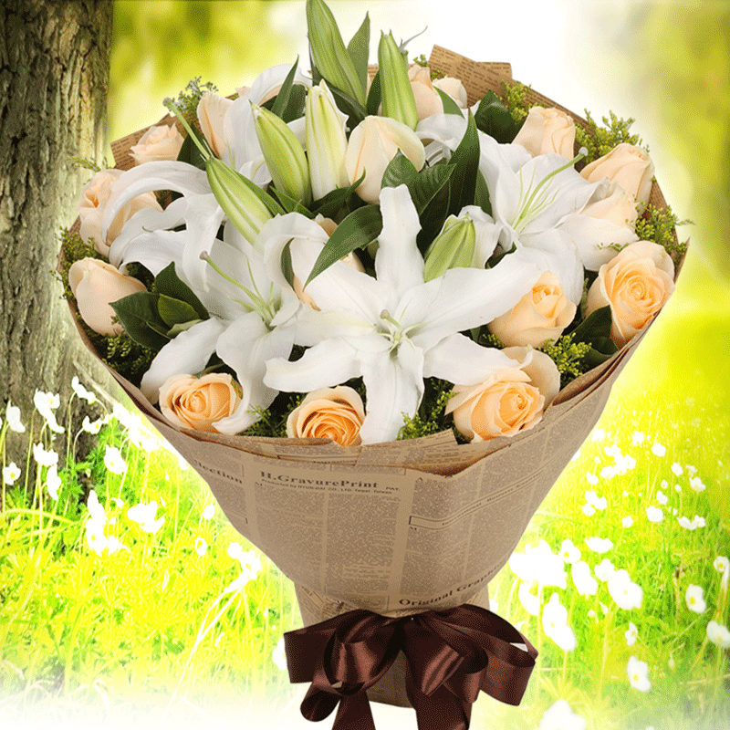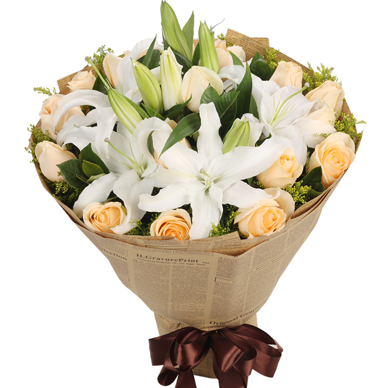 花 材:12朵白百合,18朵香槟玫瑰,黄莺、栀子叶点缀。