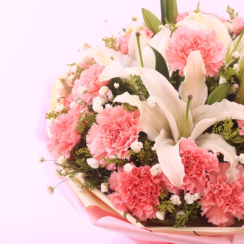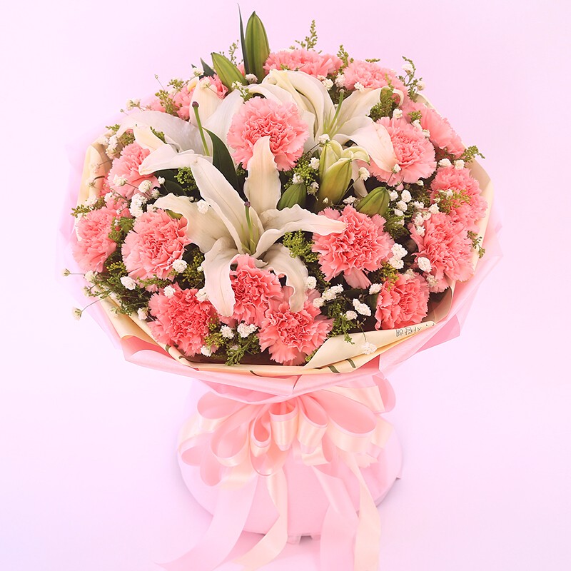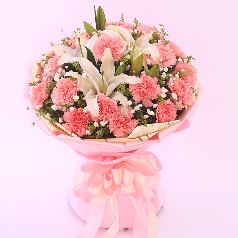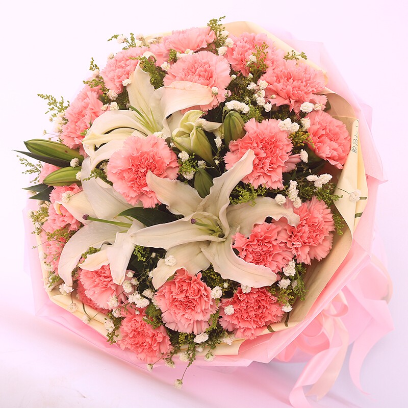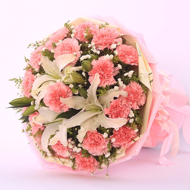 花材: 19支粉色康乃馨,3支多头香水百合,搭配满天星、黄莺装饰。