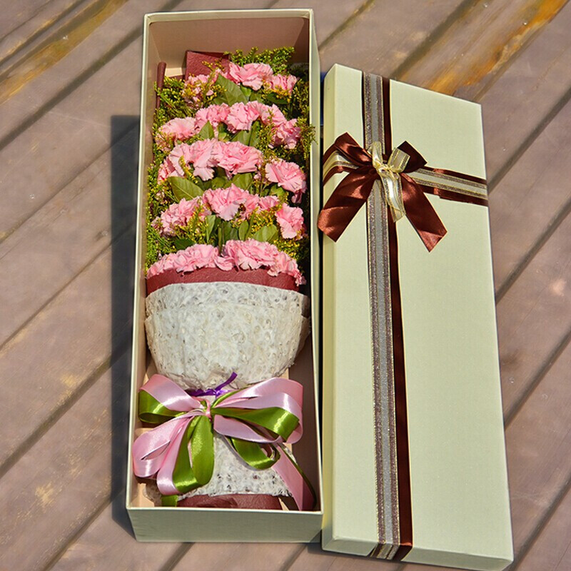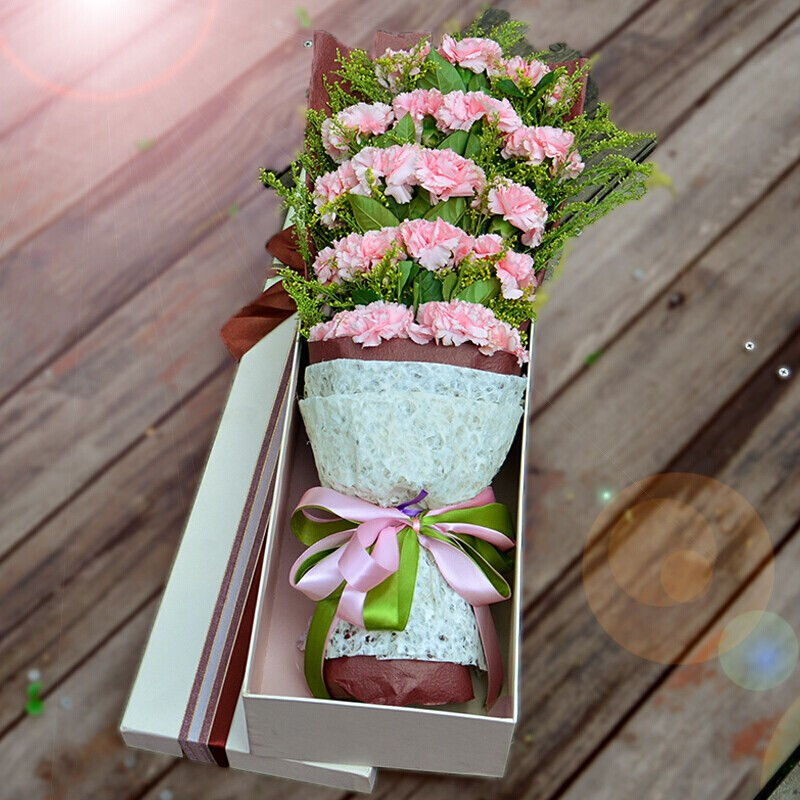 花 材:19朵精品粉色康乃馨,搭配黄莺草、栀子叶装饰。