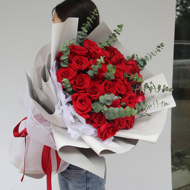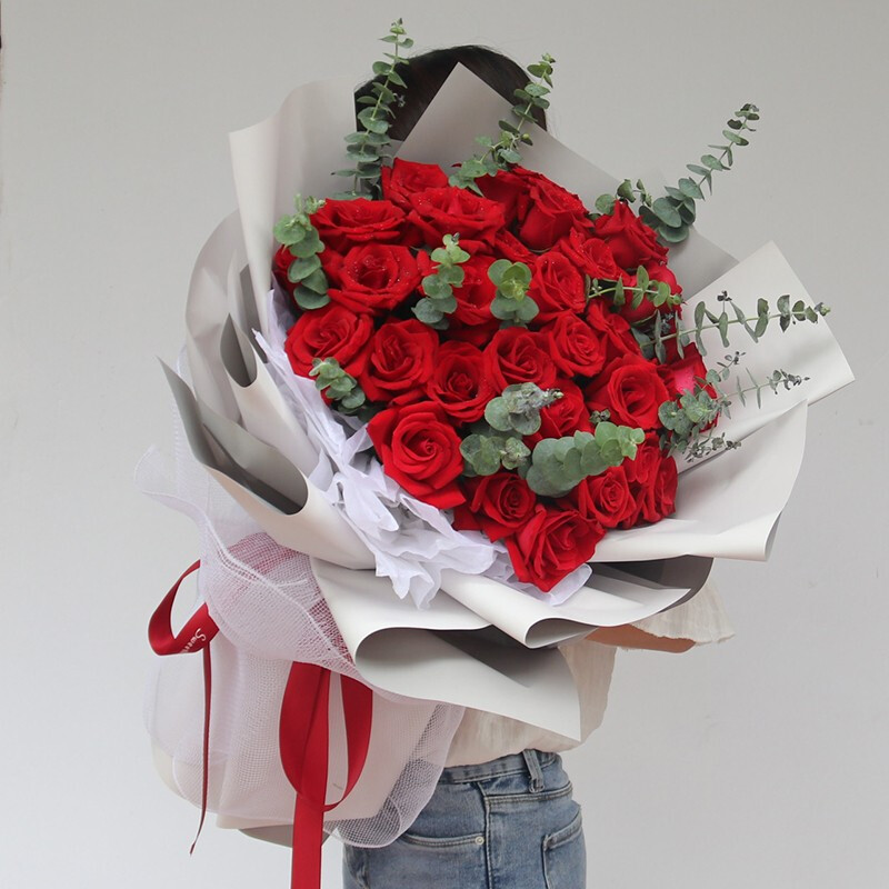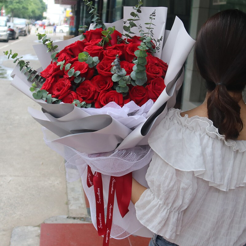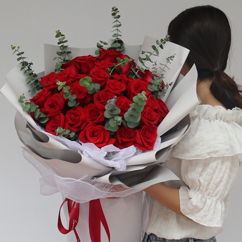 花材: 33朵极品红玫瑰,搭配尤加利叶装饰。