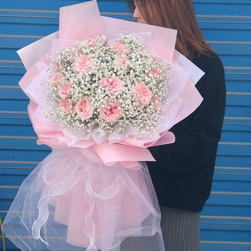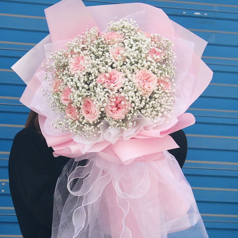 包 装:白色手揉纸内衬,粉色雾面纸扇形包装,外层白色韩式网纱装饰,白色丝带花结。