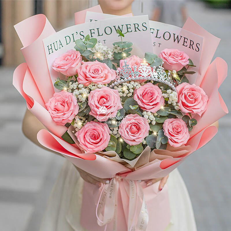 花材: 11朵粉玫瑰,1条灯带,1个皇冠(样式随机),搭配满天星尤加利叶装饰。