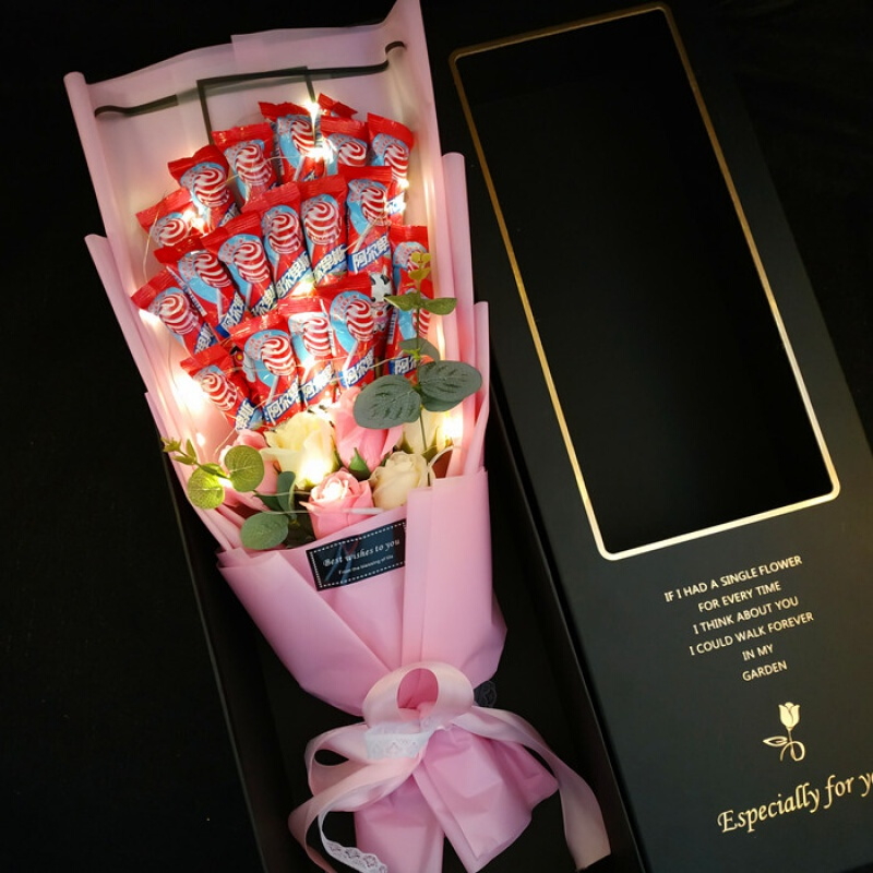 花材: 33颗阿尔卑斯,3朵粉玫瑰,3朵香槟玫瑰,搭配尤加利叶点缀。