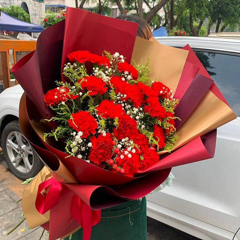 花 材:19朵精品红色康乃馨,搭配黄莺草、白色满天星装饰。