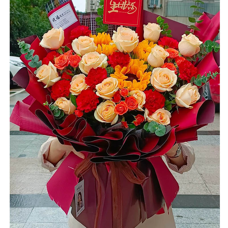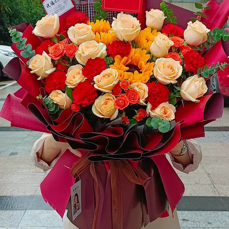 花 材:3支向日葵,16朵香槟色玫瑰,9朵红色康乃馨,搭配3支橙色多头小玫瑰(断货则用3支洋桔梗代替),尤加利叶间插装饰。