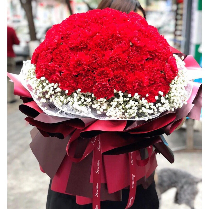花 材:99朵红色康乃馨,搭配白色满天星外围环绕。