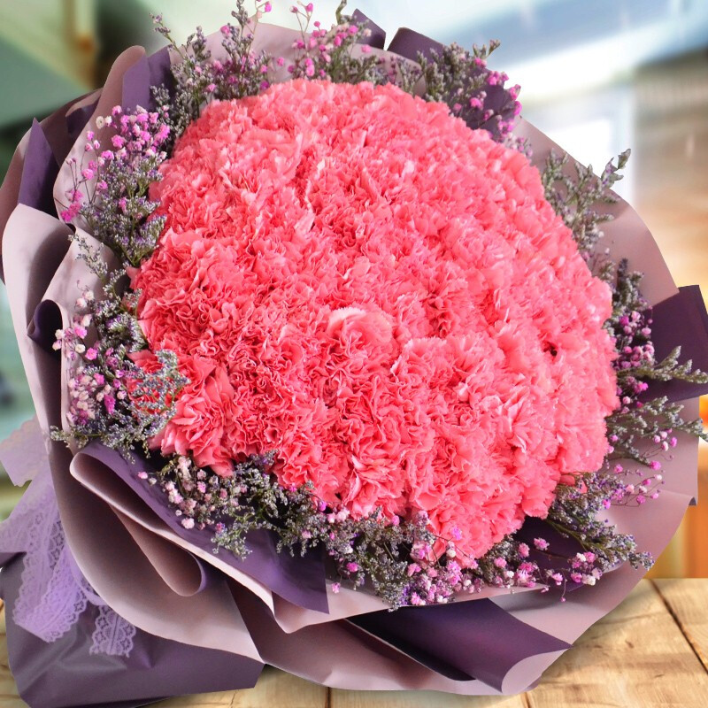 花材: 99朵粉色康乃馨,情人草、粉色满天星外围环绕。