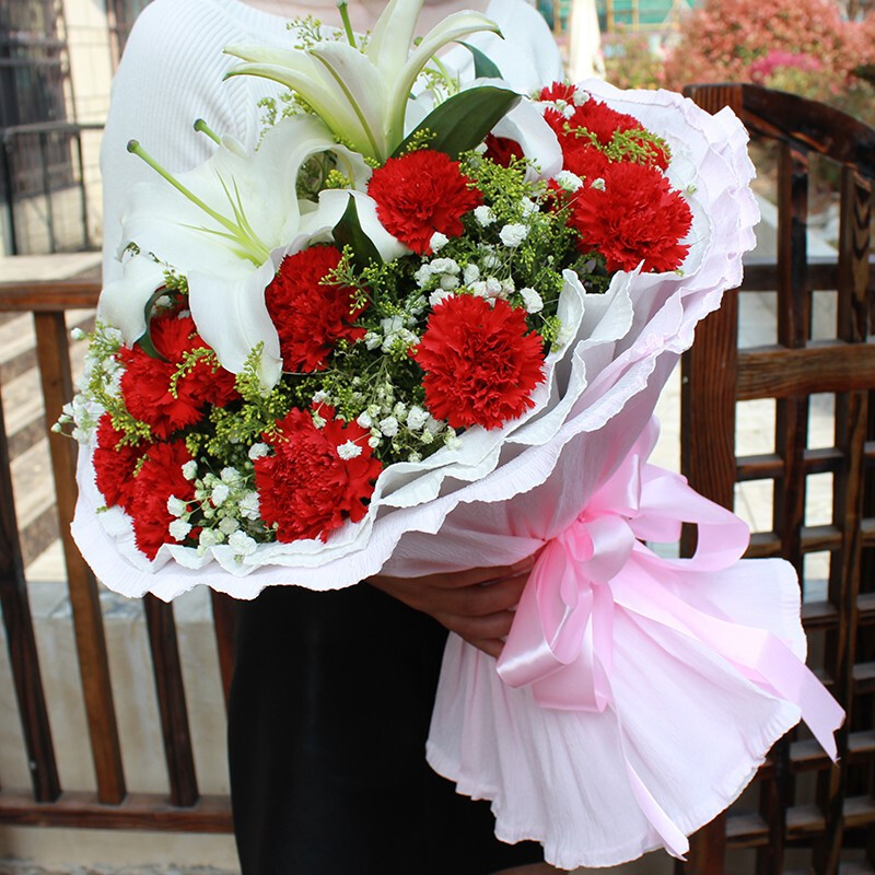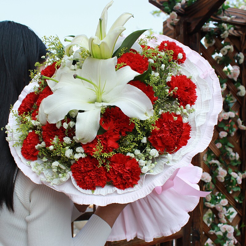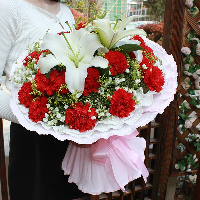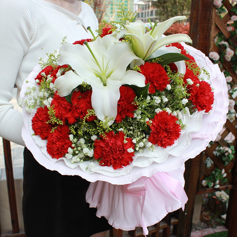 花材: 19朵红色康乃馨,1支白色多头香水百合,搭配满天星、黄莺草装饰。