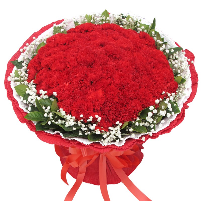 花材: 99朵红色康乃馨,搭配满天星、栀子叶外围环绕。