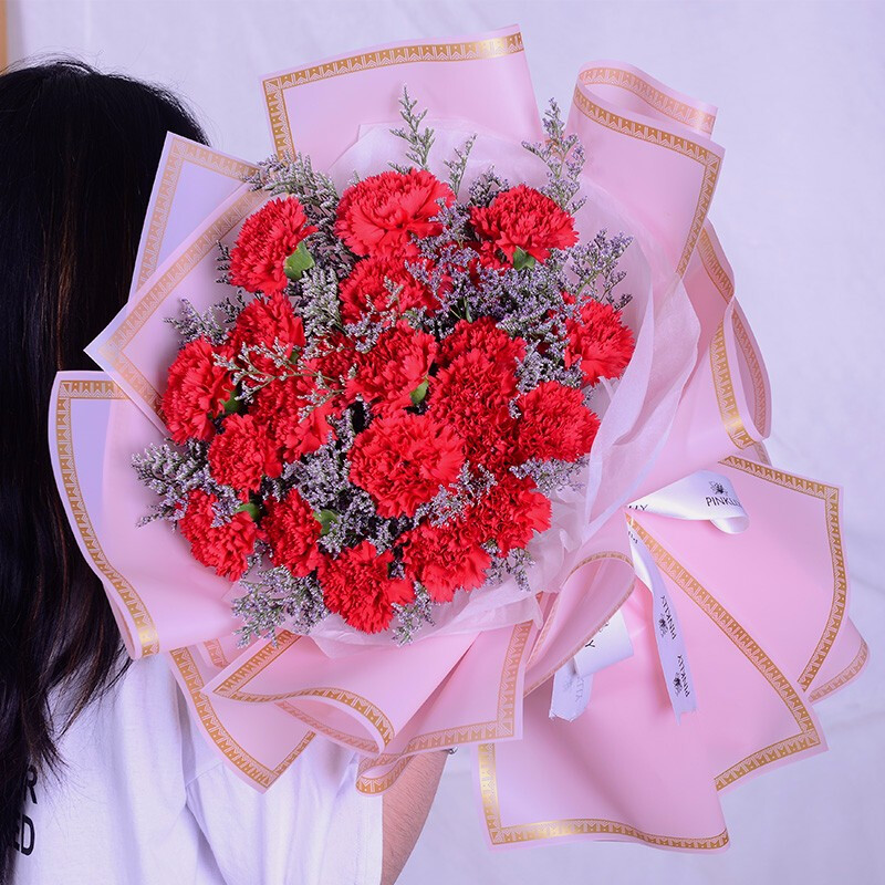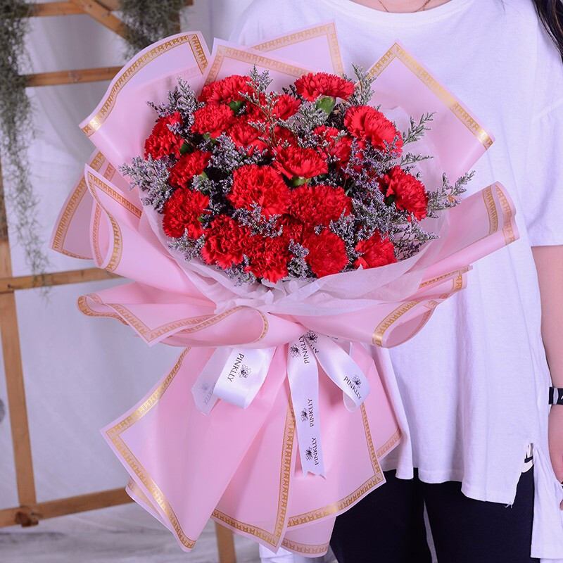 花材: 33朵红色康乃馨,搭配情人草装饰。