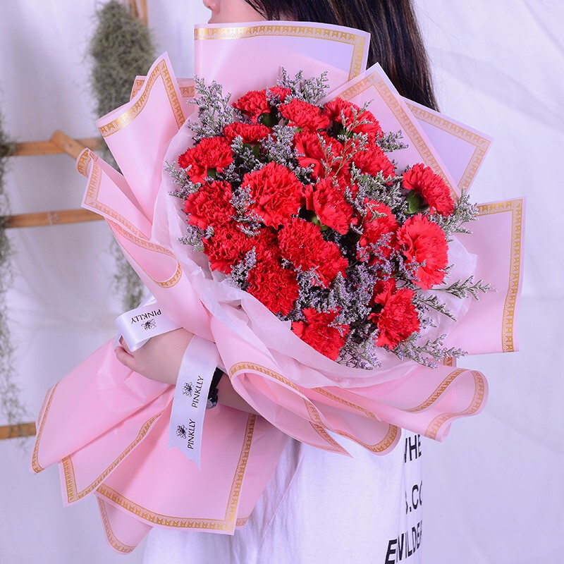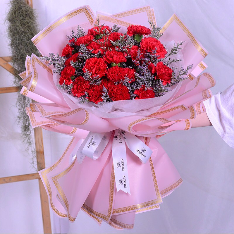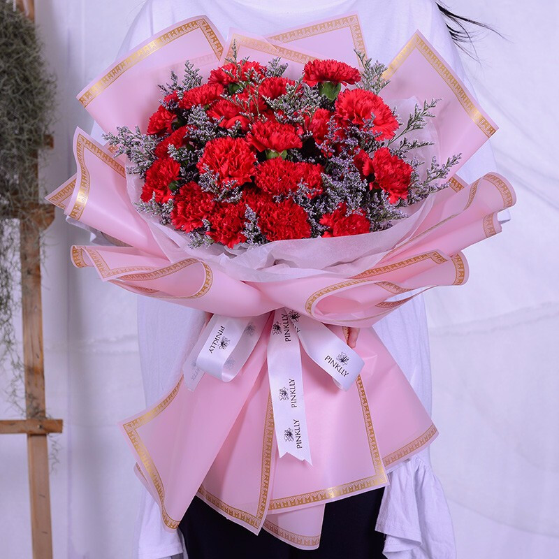 花 材:33朵红色康乃馨,搭配情人草装饰。