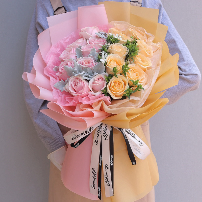 包 装:粉色玫瑰的半边外围用同色系粉色包装纸包装,香槟色玫瑰的半边外围用同色系香槟色包装纸包装,香槟色+黑色缎带花结。