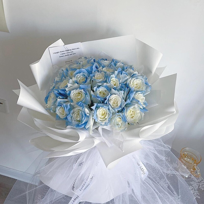花 材:33枝碎冰蓝玫瑰(珍贵稀少花材,请提前预订或咨询花艺师)