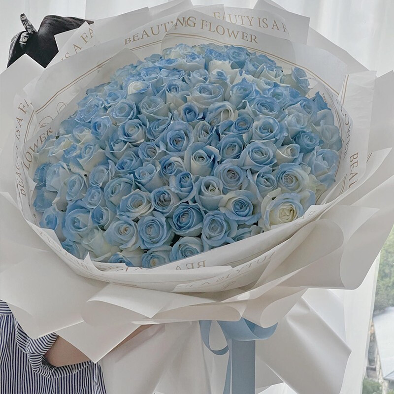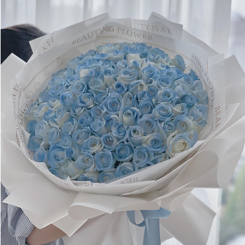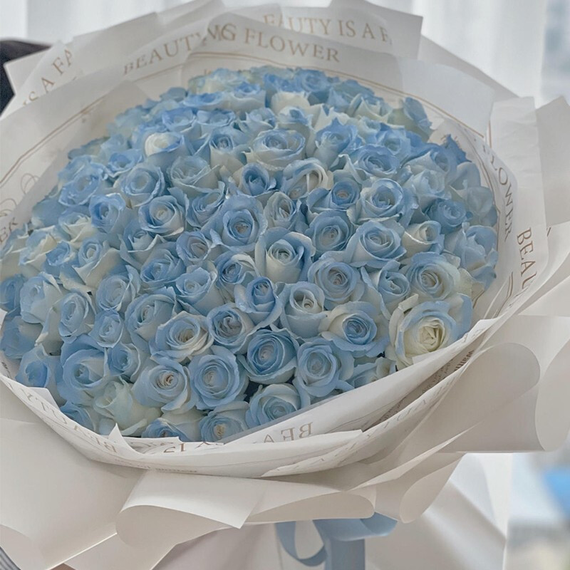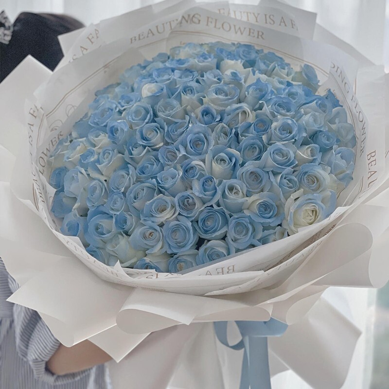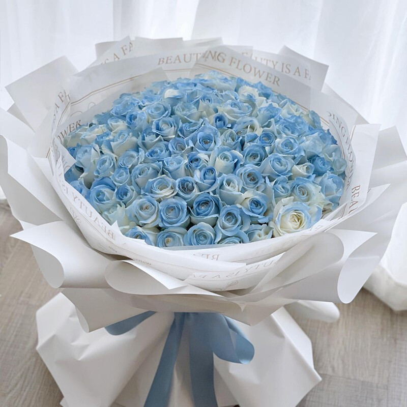 花材: 精选99朵碎冰蓝玫瑰。(珍贵稀少花材,请提前预订或咨询花艺师)