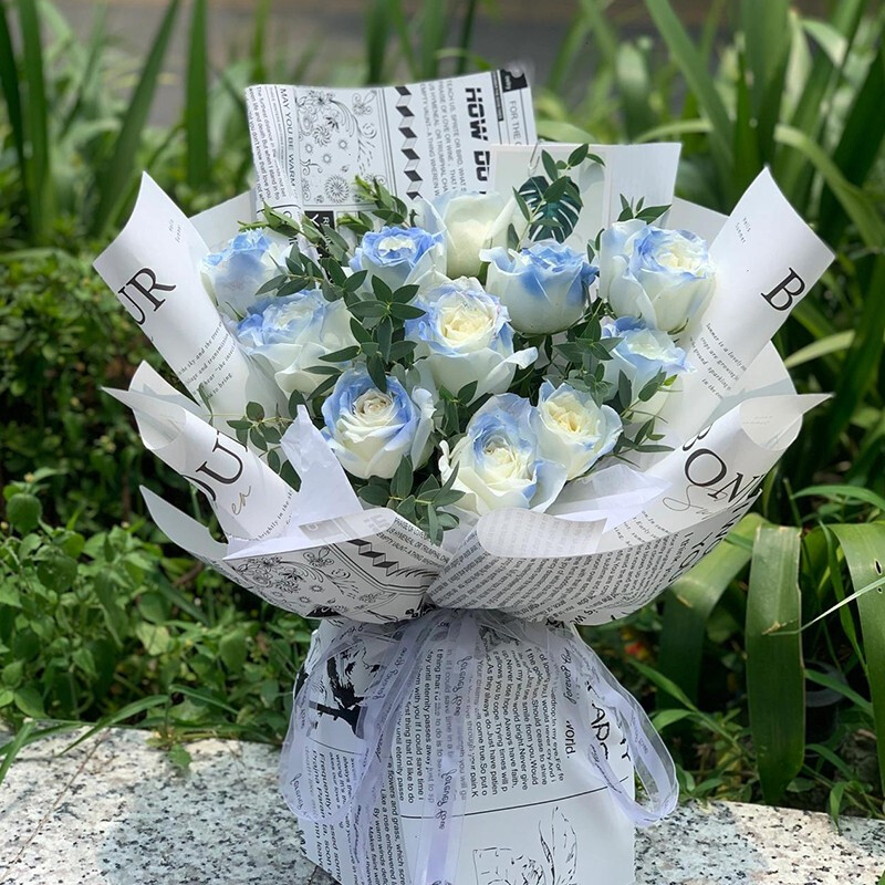 花材: 11朵碎冰蓝玫瑰,搭配尤加利叶装饰。(珍贵稀少花材,请提前预订或咨询花艺师)