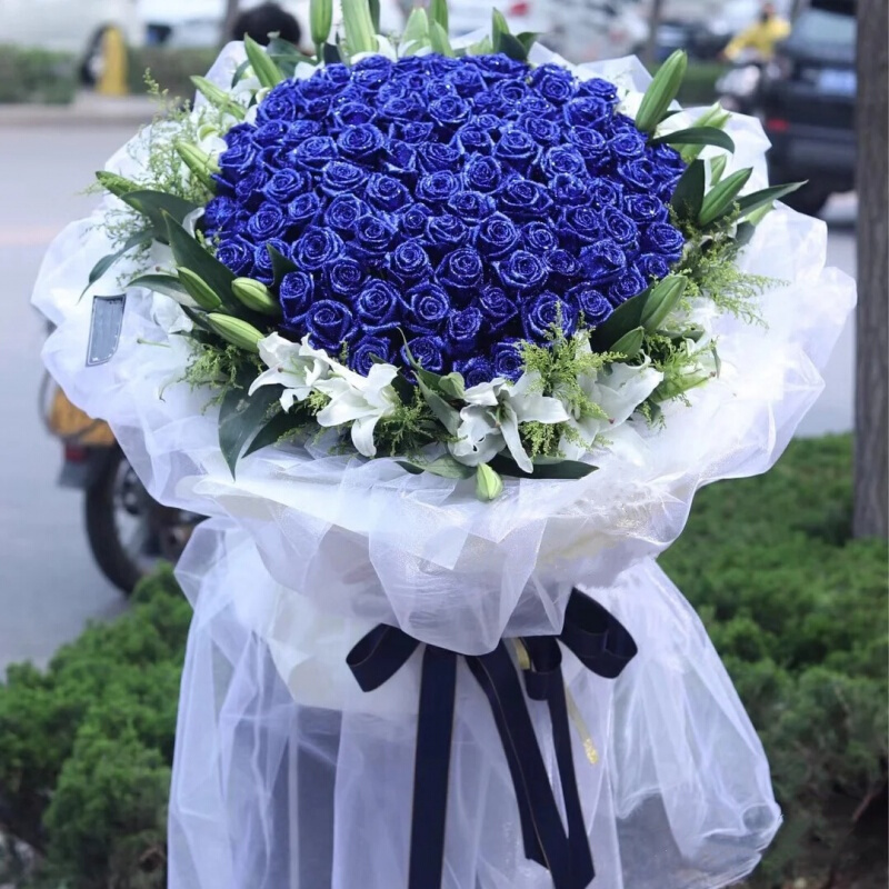 花材: 99朵精品蓝色妖姬,11支多头白色香水百合外围环绕,搭配黄英草装饰。