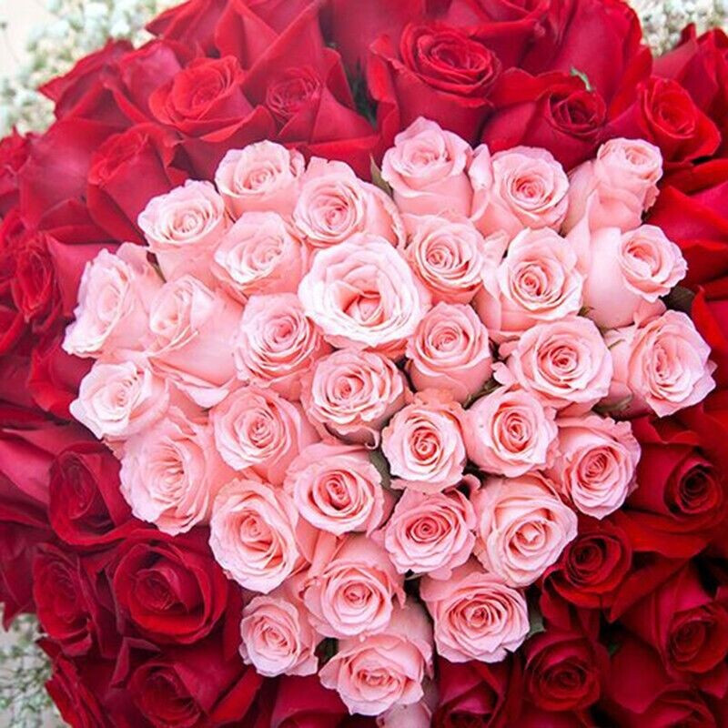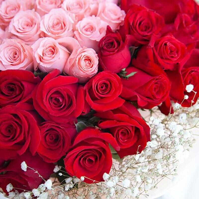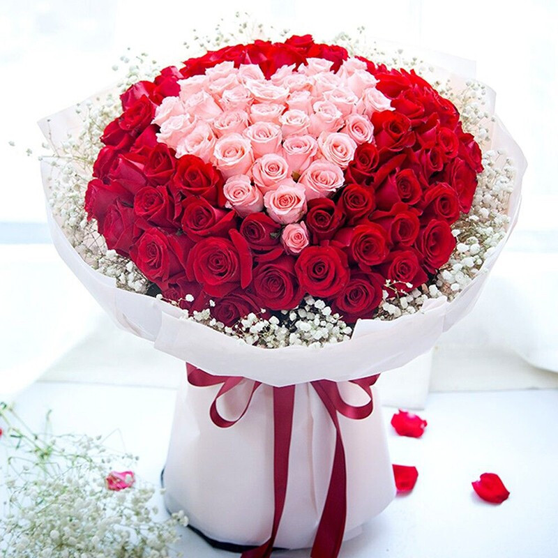花 材:精选99朵玫瑰,粉玫瑰心形造型,红玫瑰环绕,外围白色满天星装饰。