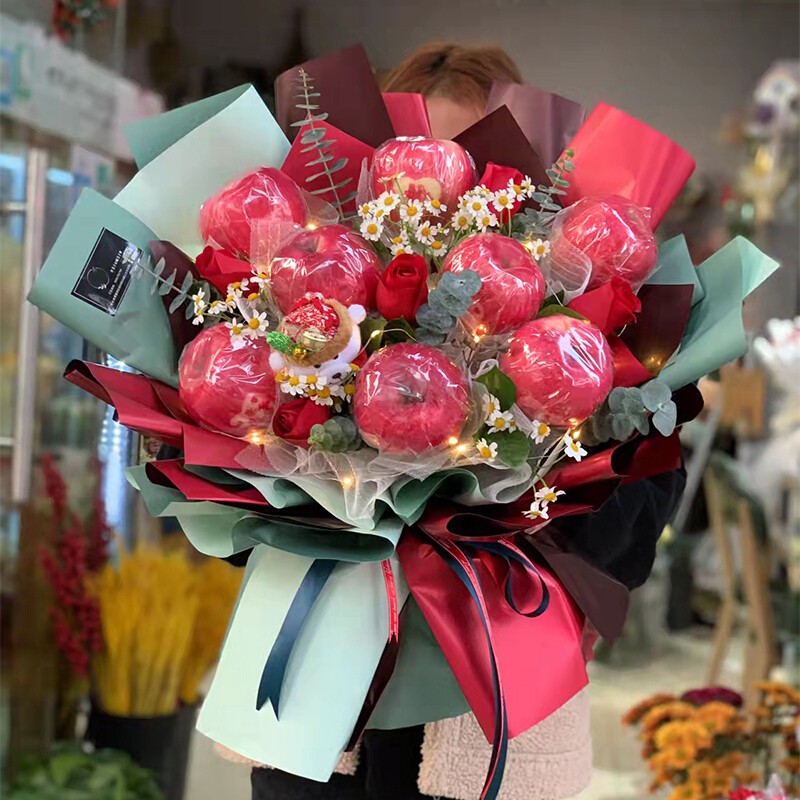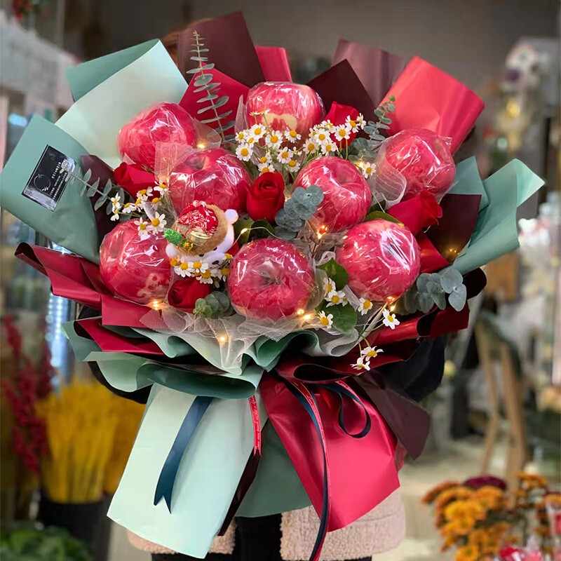 花 材:8个红苹果,5朵红玫瑰,1只小熊公仔,搭配白色小雏菊(或白色满天星),尤加利叶,栀子叶装饰。