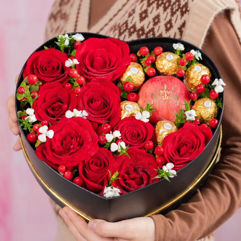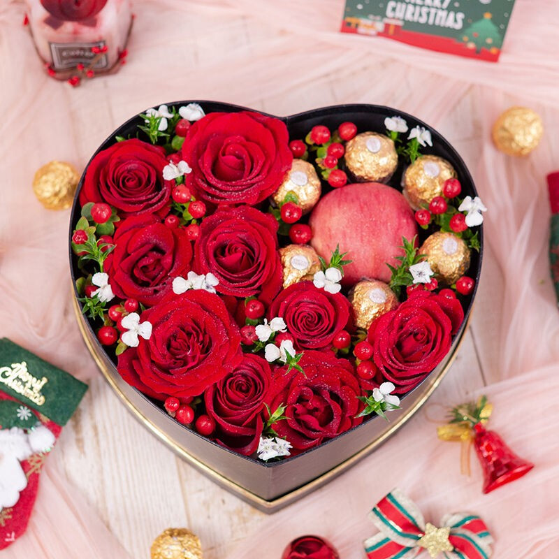 花材: 精选9枝卡罗拉红玫瑰,6粒费列罗,1颗红苹果,搭配红豆、白色相思梅,绿叶装饰。