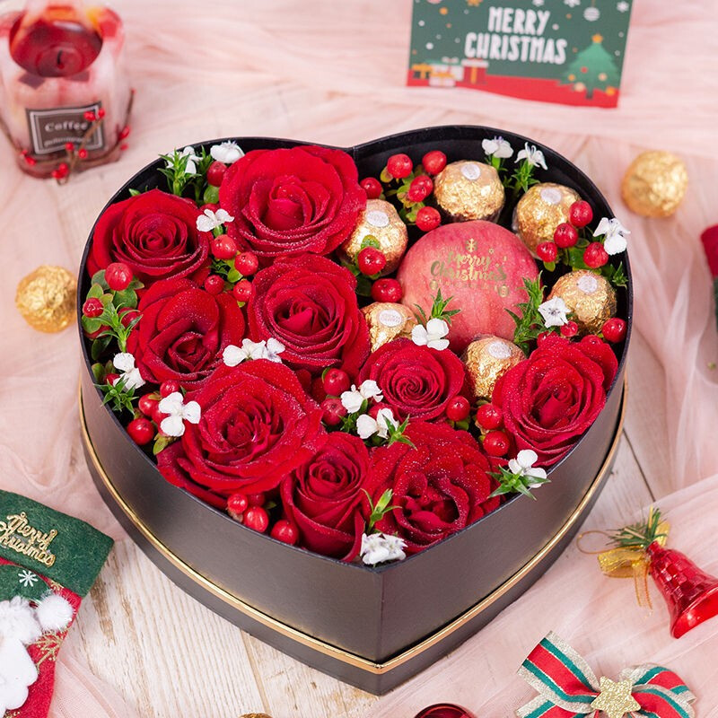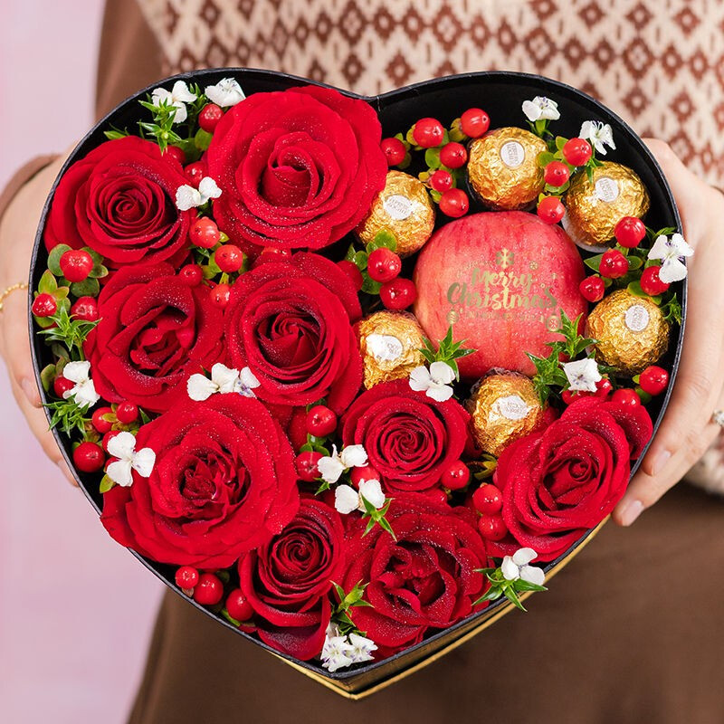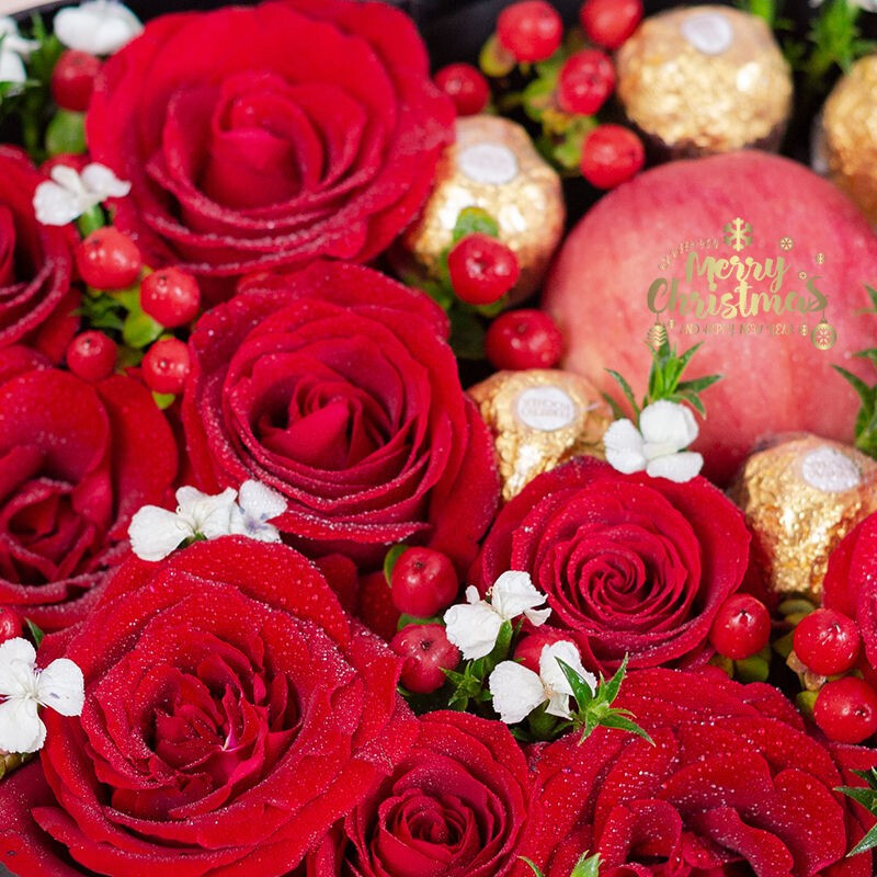 花 材:精选9枝卡罗拉红玫瑰,6粒费列罗,1颗红苹果,搭配红豆、白色相思梅,绿叶装饰。