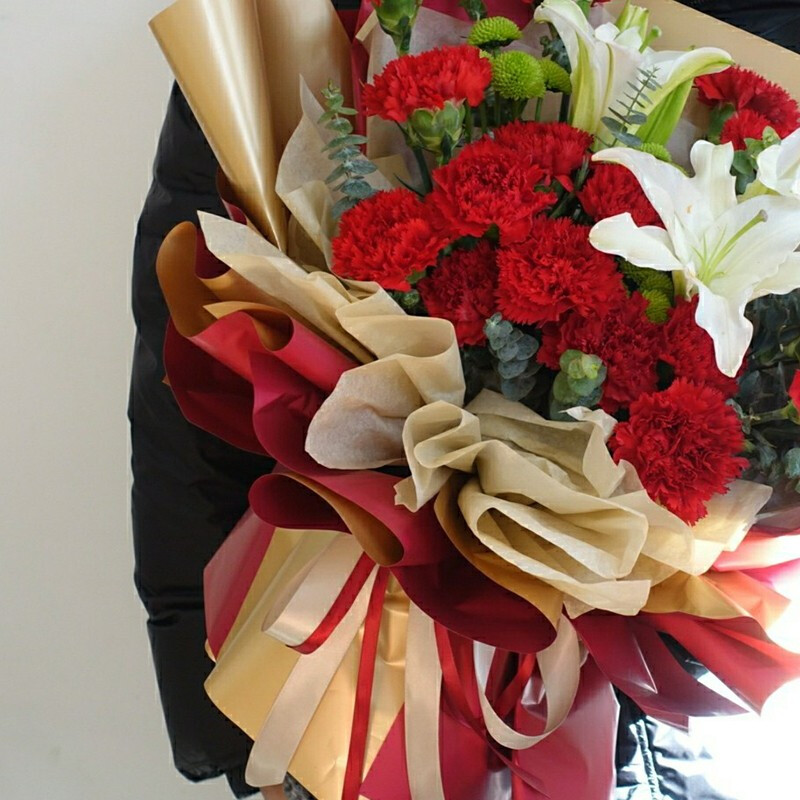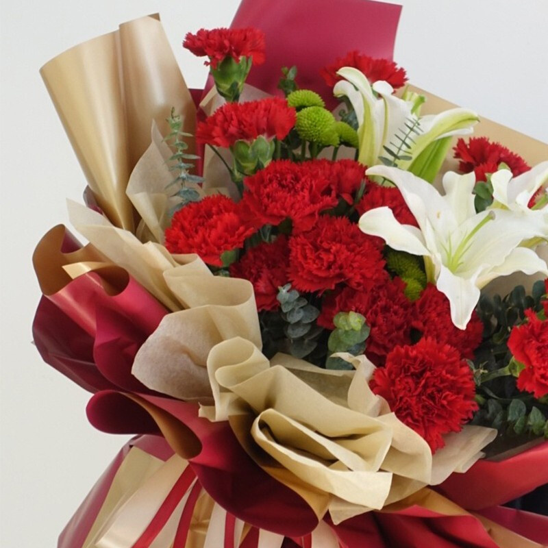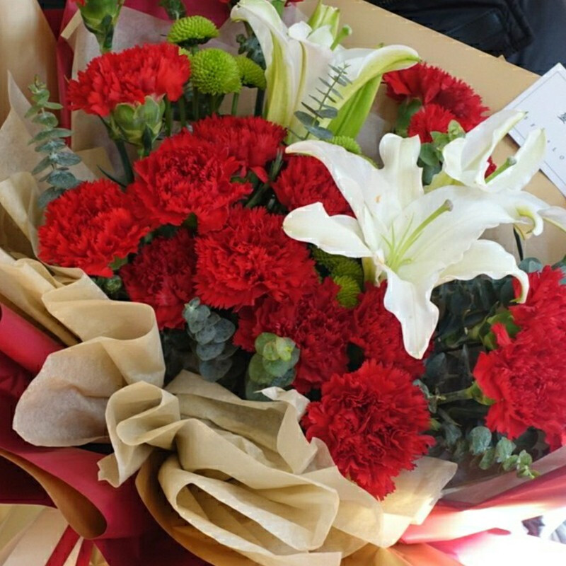 花 材:19朵精品红色康乃馨,1支白色多头香水百合,搭配尤加利叶、小雏菊装饰。