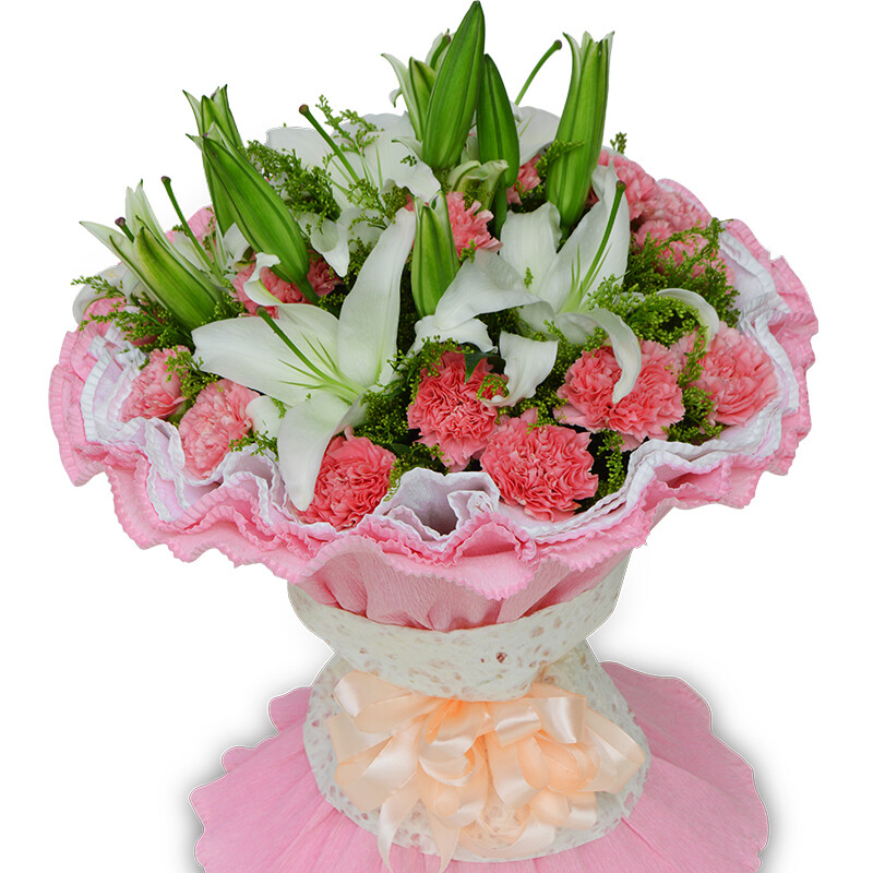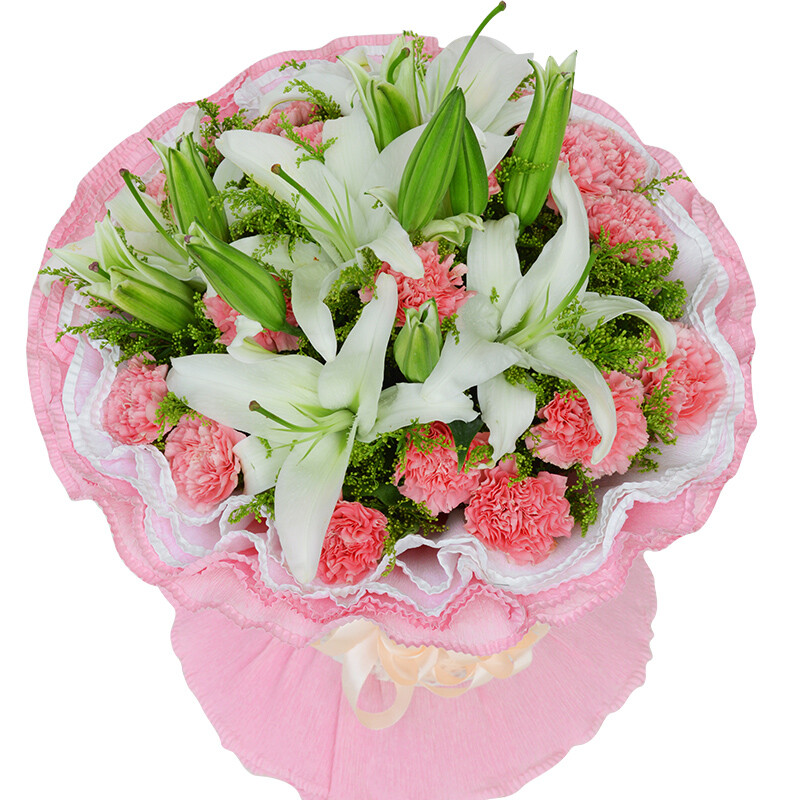 花材: 16朵精品粉色康乃馨,3支多头白色香水百合,搭配黄莺草间插。