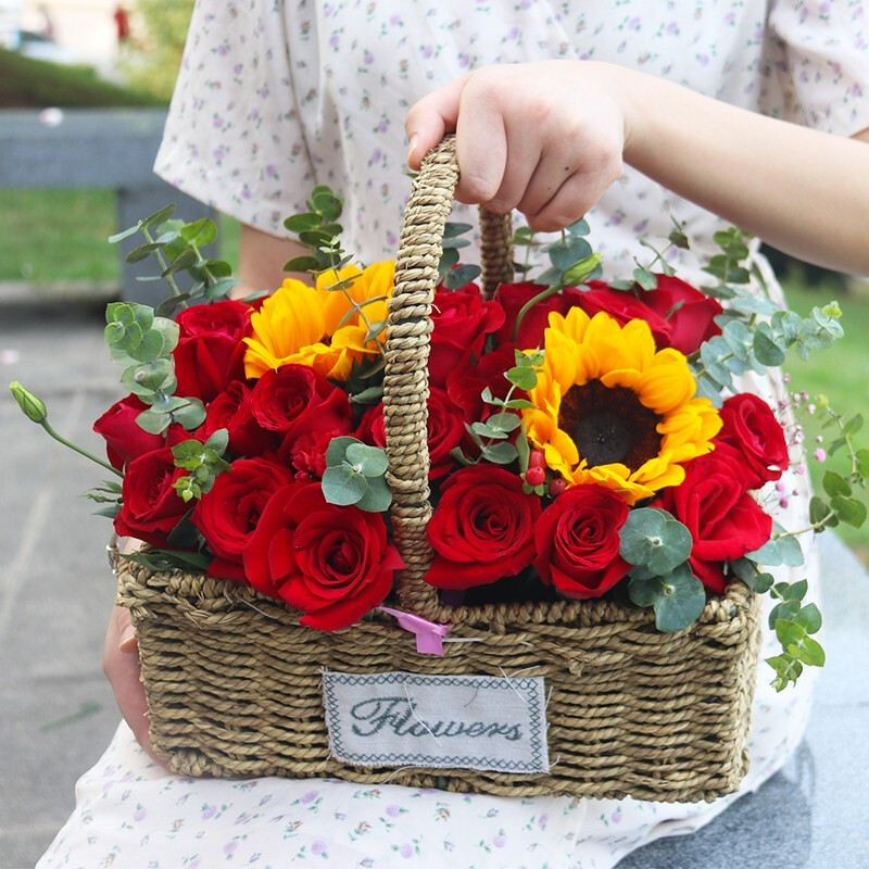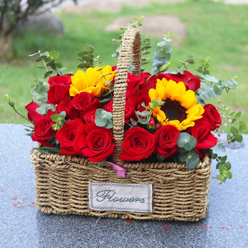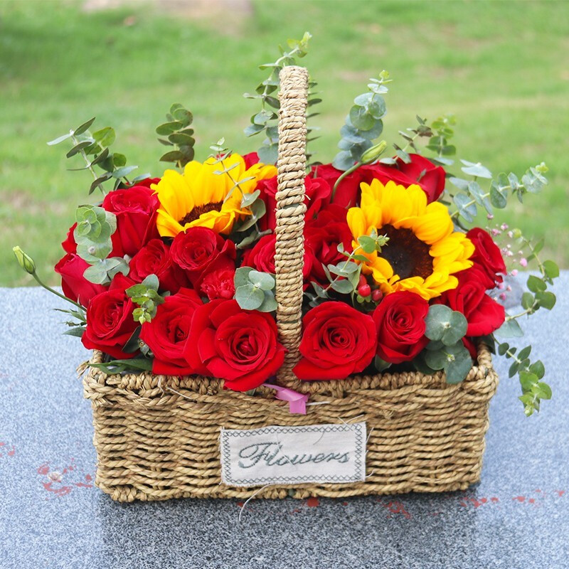 花材: 16朵红玫瑰,2支向日葵,搭配尤加利叶装饰。