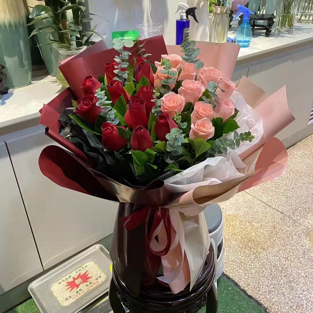 花材: 选22朵红色、粉色玫瑰(一半红色一半粉色),搭配尤加利叶装饰。