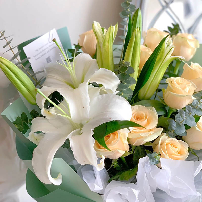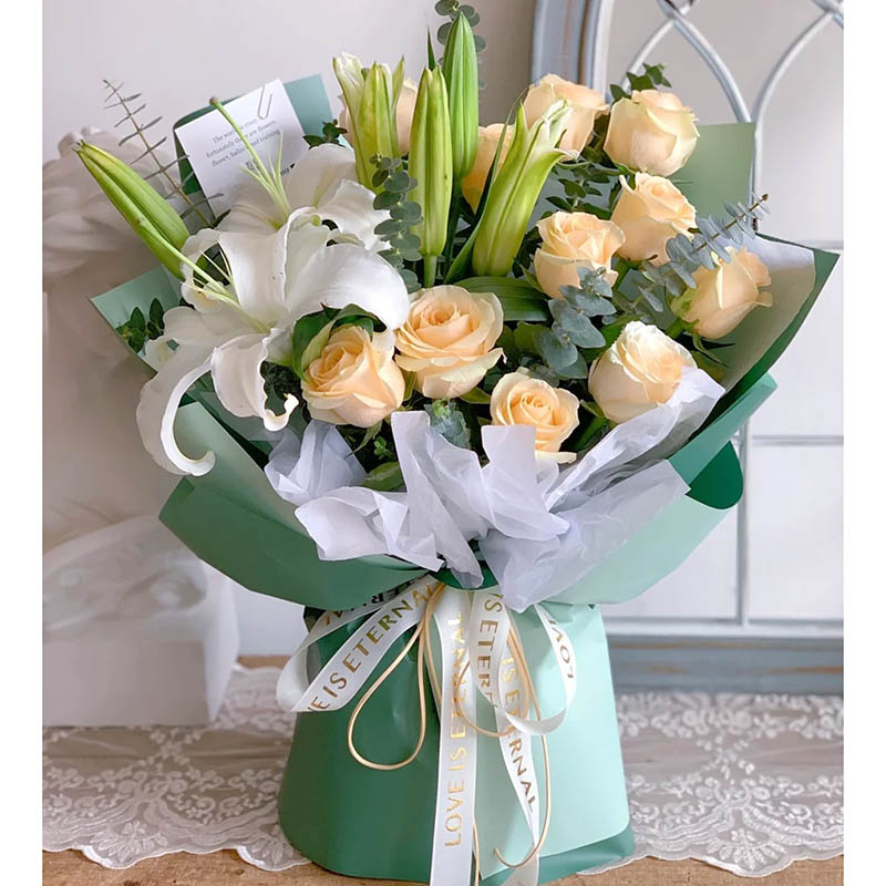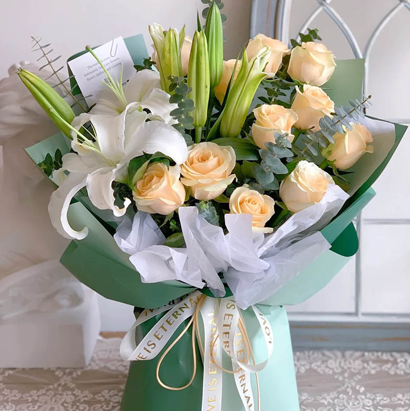 花材: 11朵香槟玫瑰,2支多头白色香水百合,搭配尤加利叶装饰。