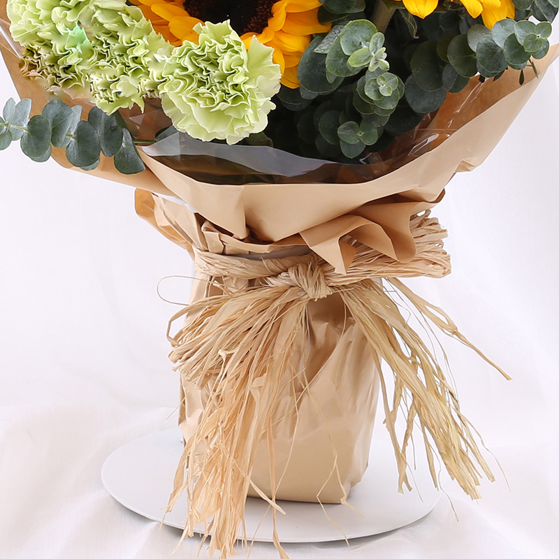 花 材:5朵向日葵,搭配洋桔梗,尤加利叶丰满间插。