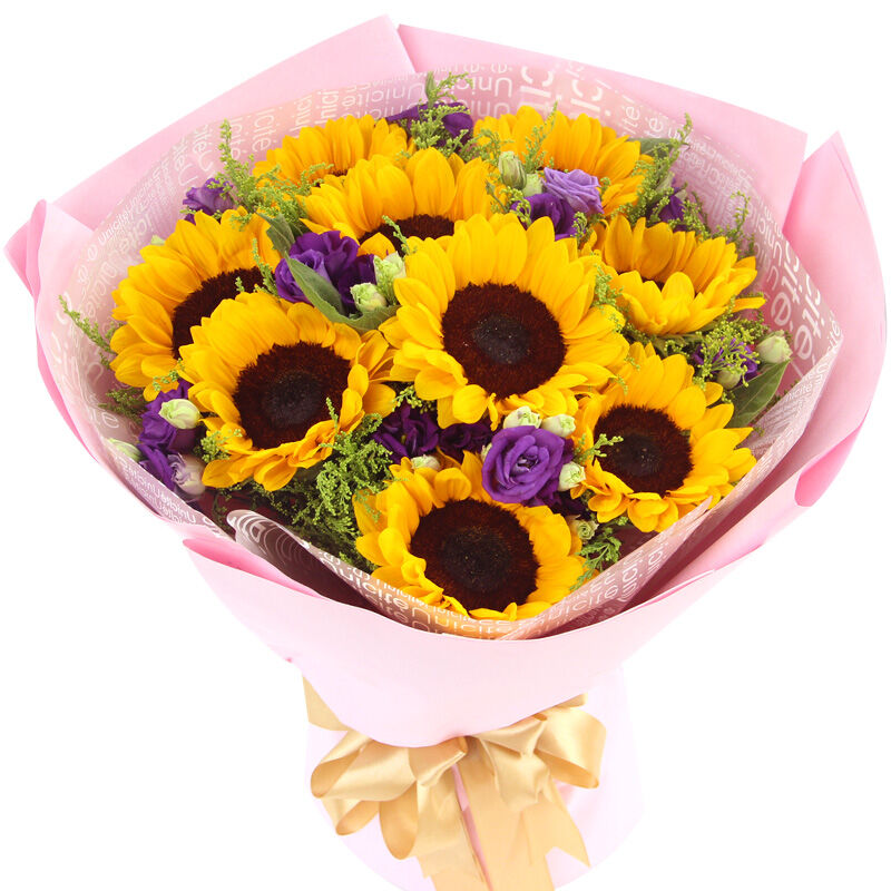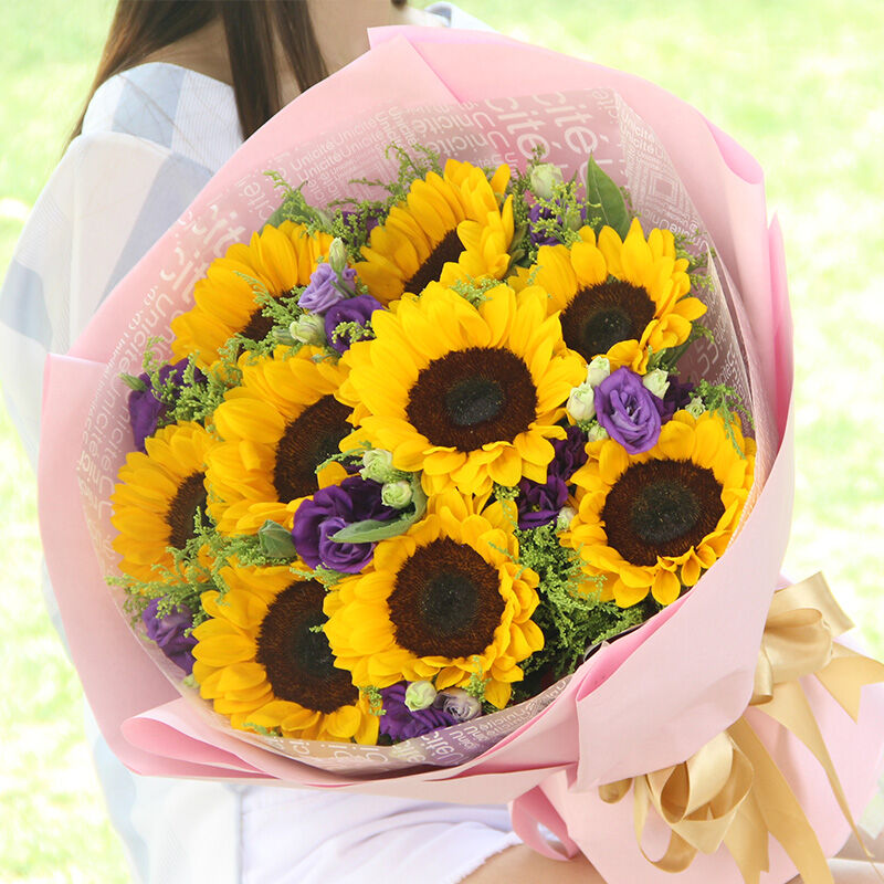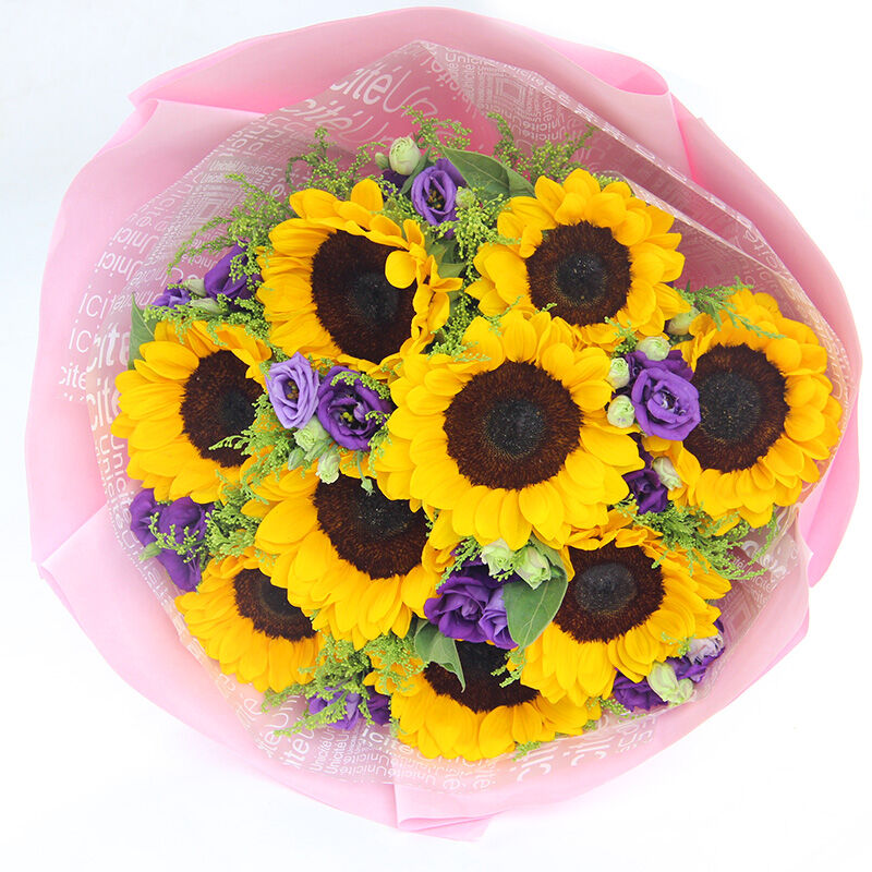 花材: 9枝向日葵,搭配黄莺、洋桔梗。