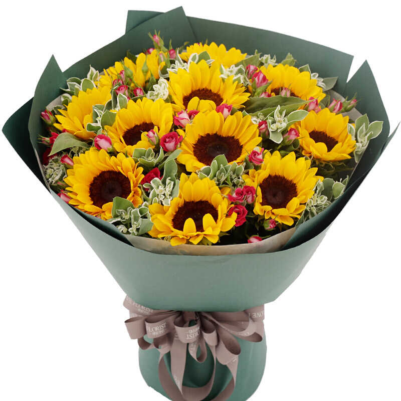 花材: 精选11支向日葵,搭配砖石玫瑰、高山积雪丰满点缀。