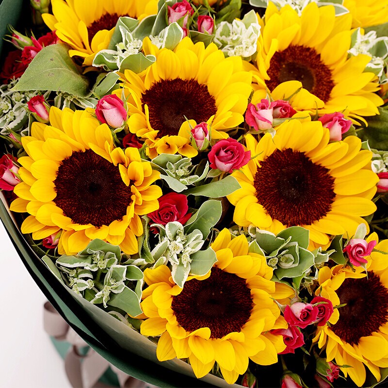 花 材:精选11支向日葵,搭配砖石玫瑰、高山积雪丰满点缀。