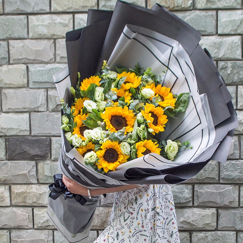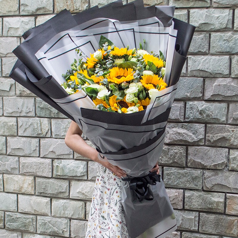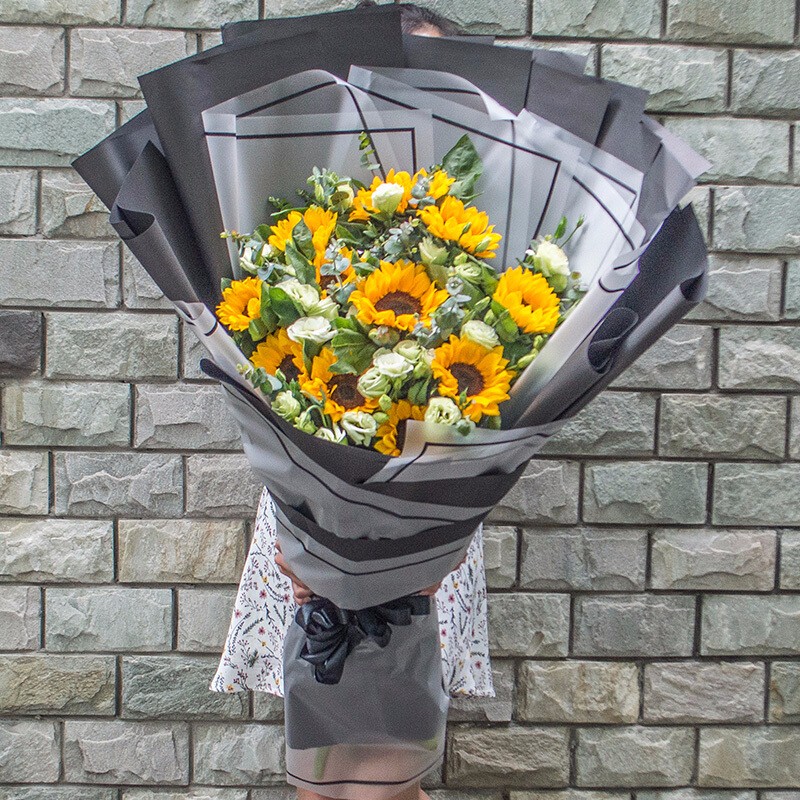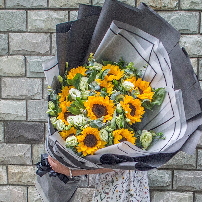 花 材:11朵向日葵,搭配桔梗,尤加利叶、栀子叶;花束高度大于1.4m(请提前1-3天定制或咨询客服。)
