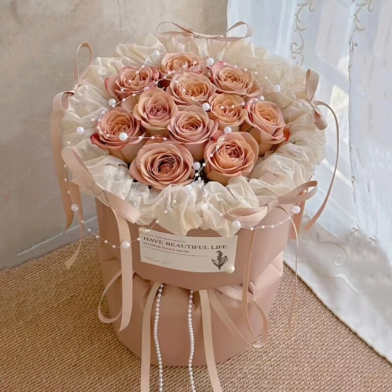 花材: 精选11枝卡布奇诺玫瑰,珠串装饰花面花体,5支同色系蝴蝶结围绕包装装饰,白色纸内衬,同色系小香风包装,珠串和同色系缎带花结。