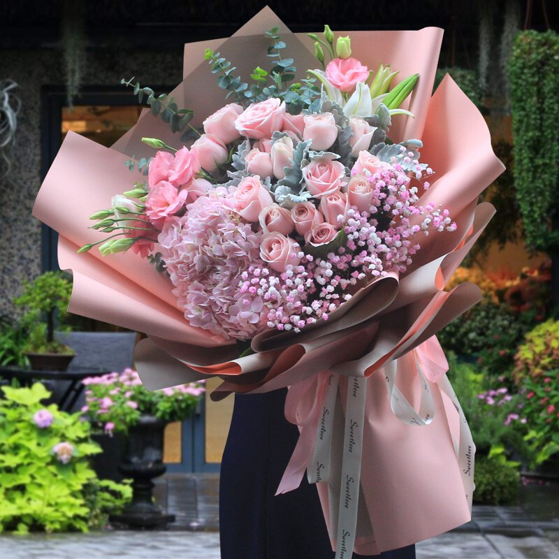 花 材:19朵粉玫瑰,1支粉色绣球花,3支洋桔梗,1支白色香水百合,搭配粉色满天星,尤加利叶,银叶菊装饰。