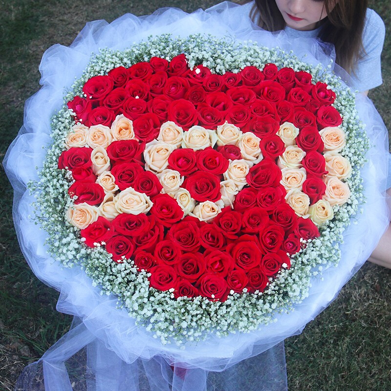 花 材:精选红玫瑰、香槟玫瑰共99枝,香槟玫瑰中间围成I♡U的图案,外围满天星丰满环绕。