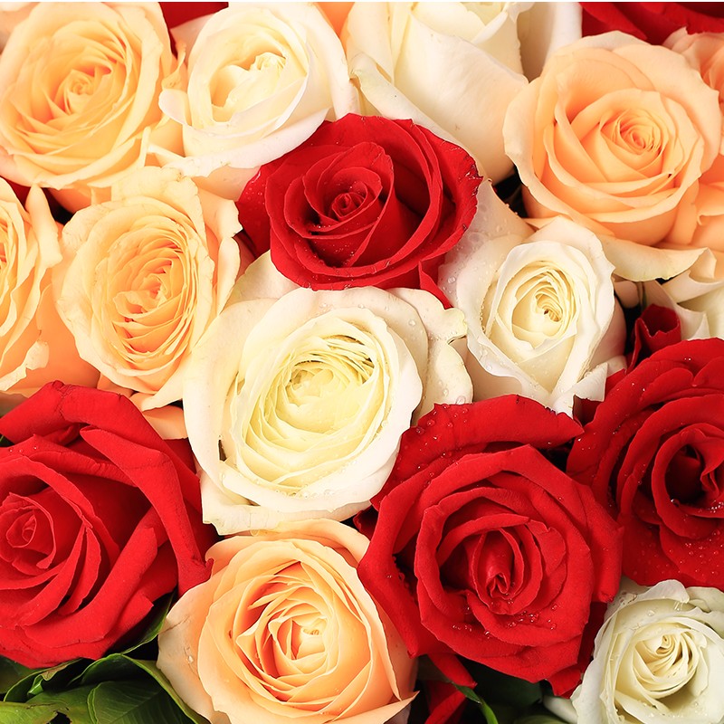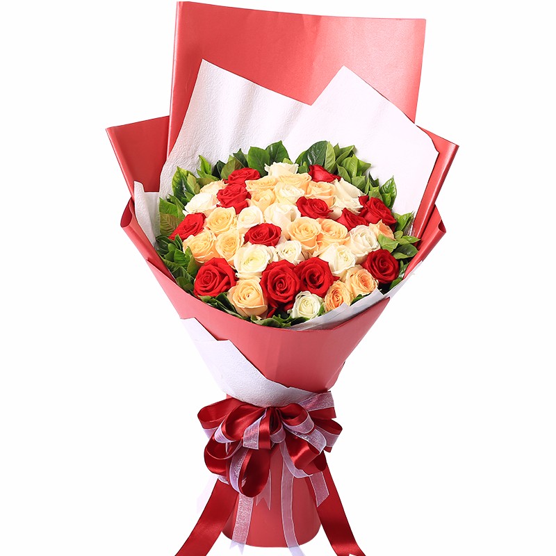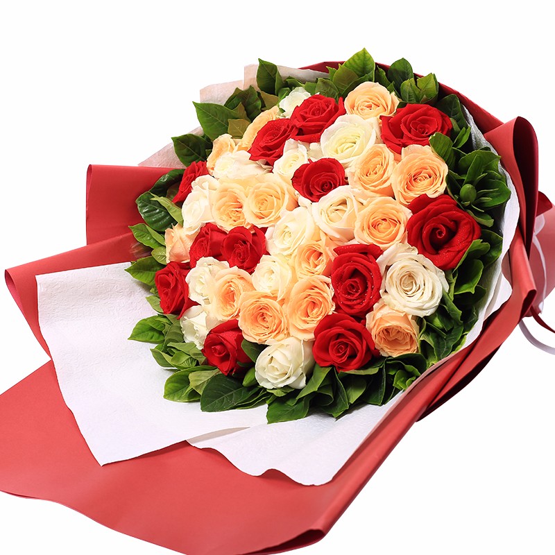 花材: 36朵混色玫瑰(红+白+香槟),搭配栀子叶外围丰满点缀。