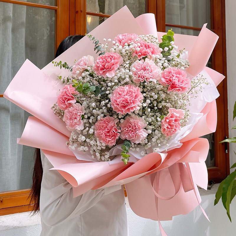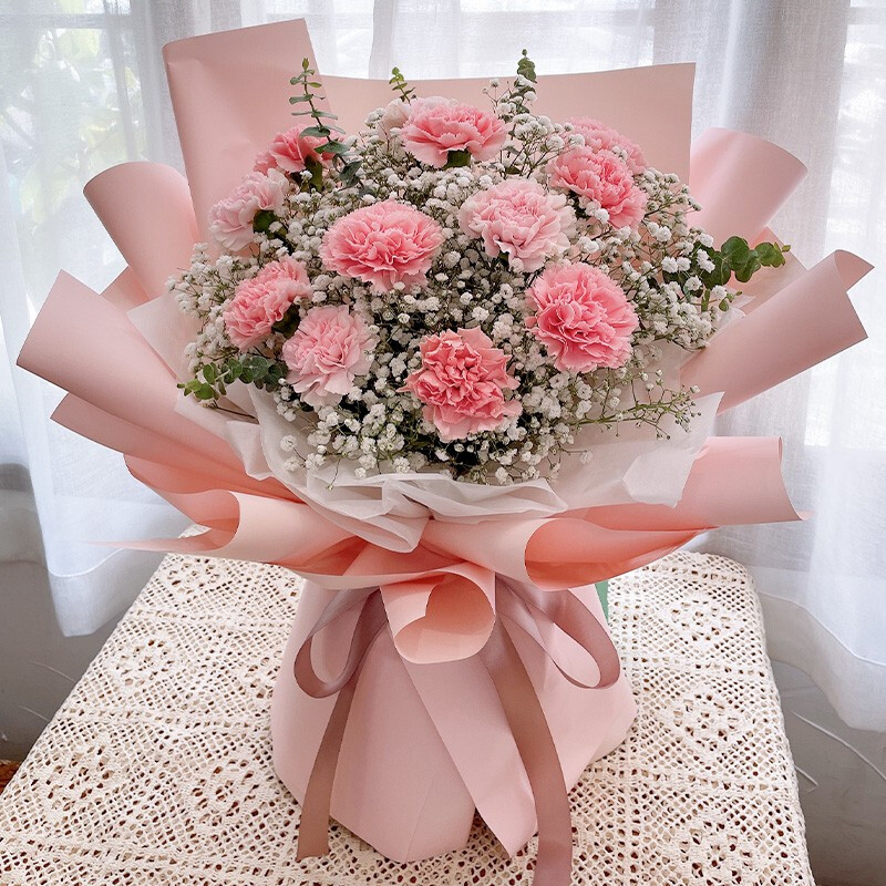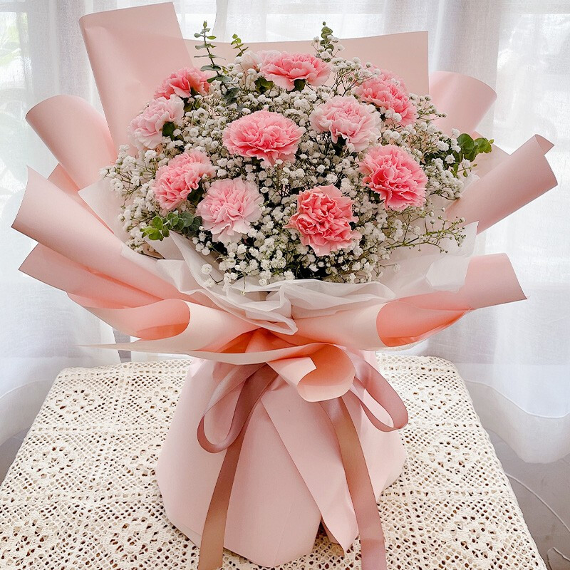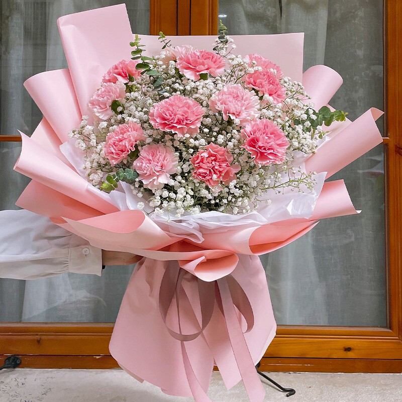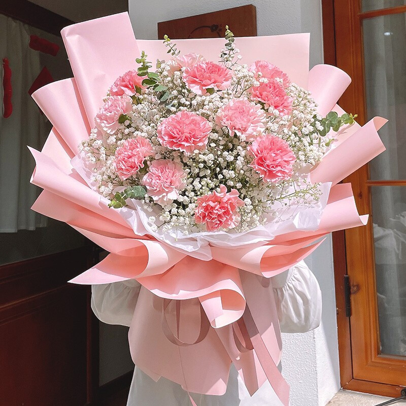 花 材:精选12朵粉色康乃馨,尤加利叶、大量白色满天星装饰。