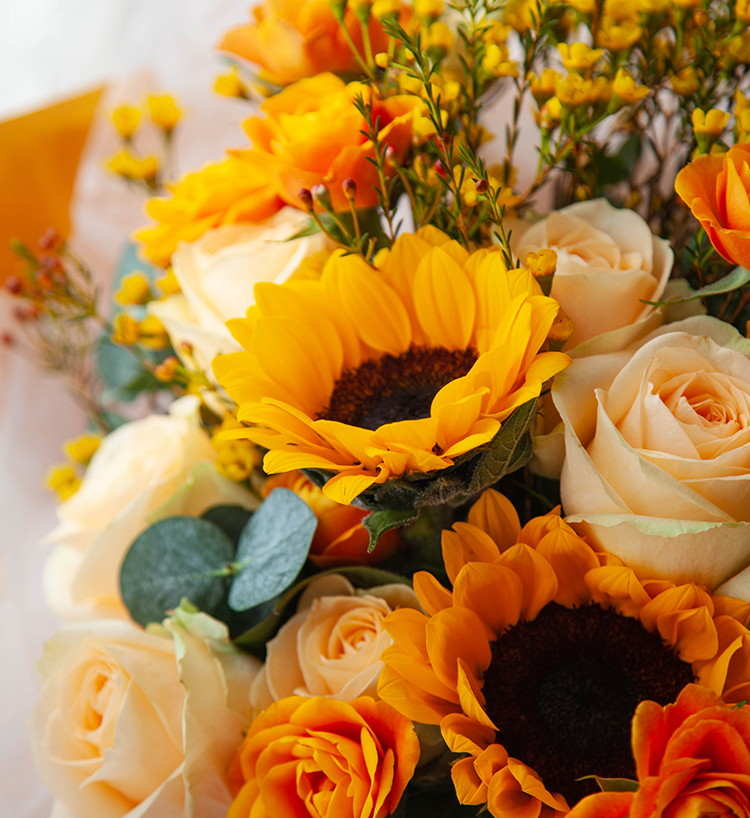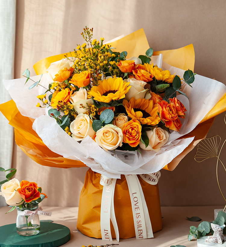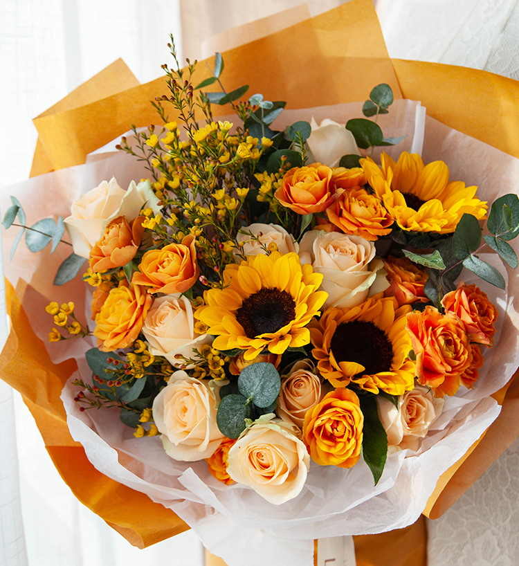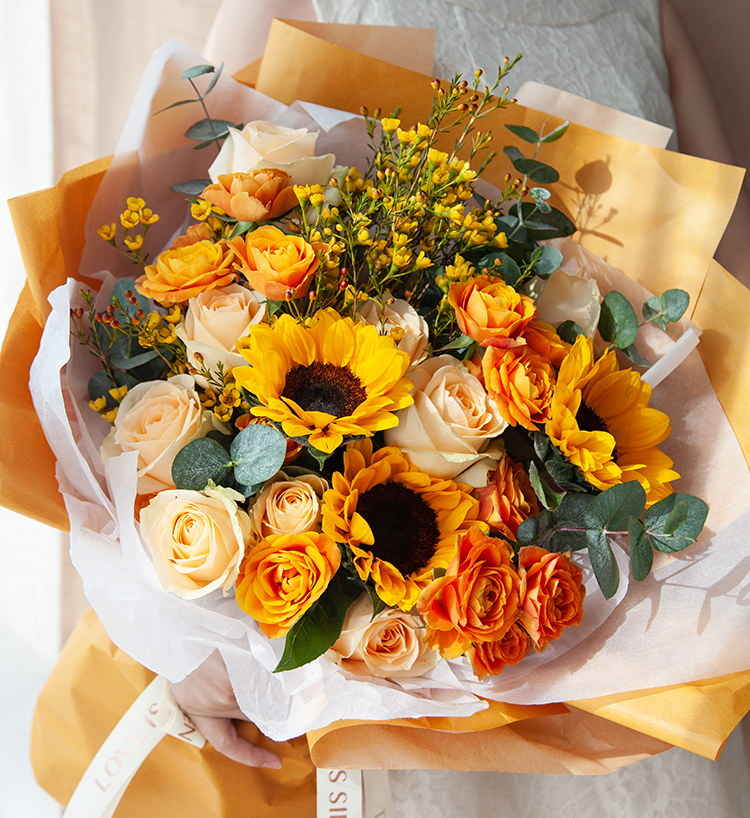 花材: 向日葵3枝、香槟玫瑰9枝、橙色多头玫5枝、黄色或橙色腊梅5枝、大叶尤加利5枝(腊梅花期为11-4月初,其他季节用跳舞兰或其他黄色线状花材代替)