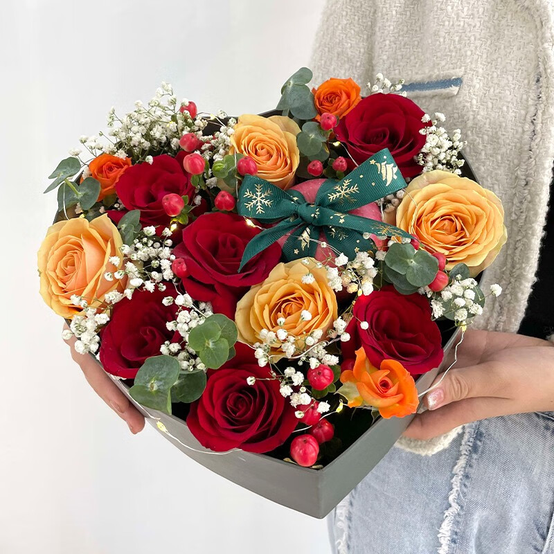 花 材:1个苹果,10朵混搭玫瑰(红玫瑰、香槟玫瑰),1个灯串,搭配3支多头小玫瑰,白色满天星,红豆,苹果表面用墨绿色缎带蝴蝶结装饰。