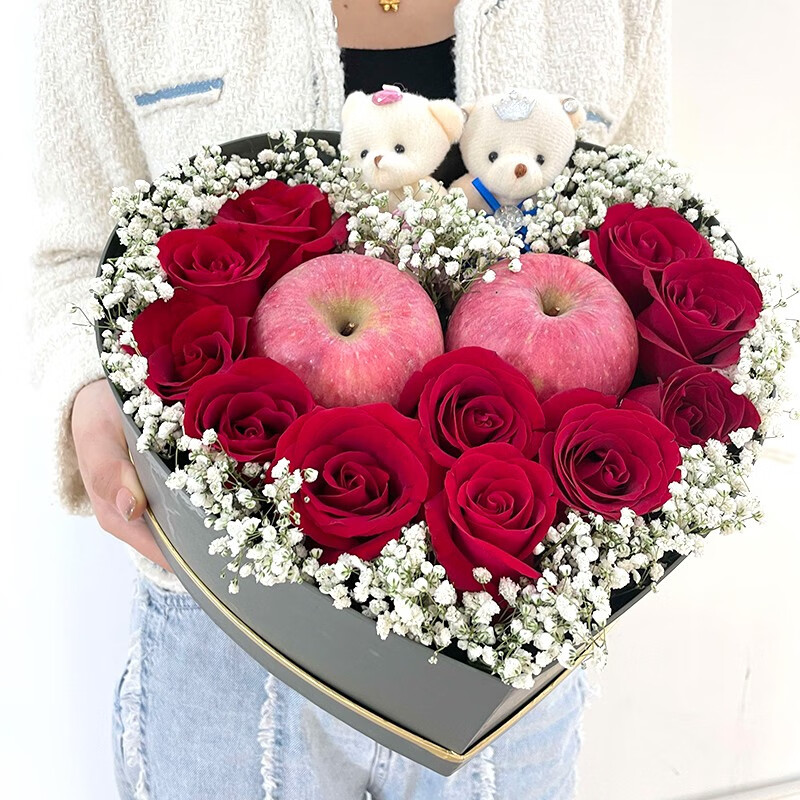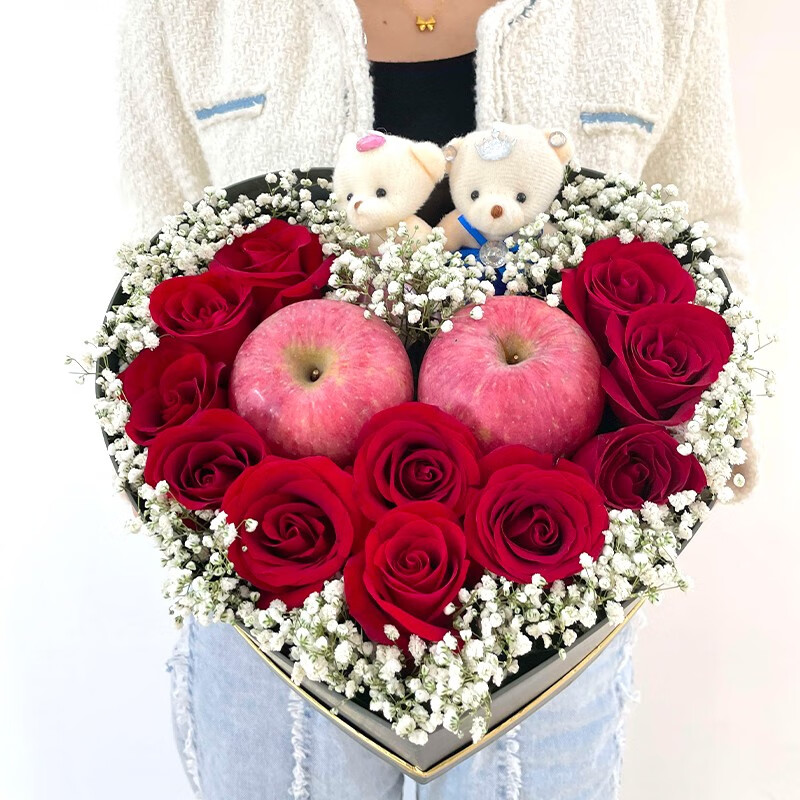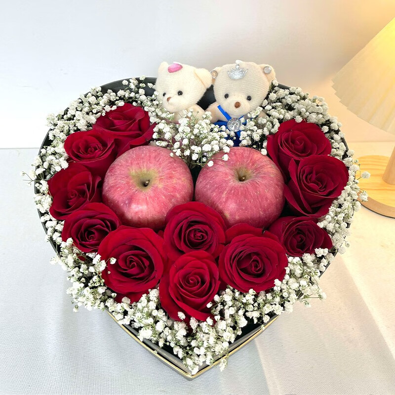 花材: 11朵红玫瑰,2颗苹果,2只小熊,白色满天星外围环绕。